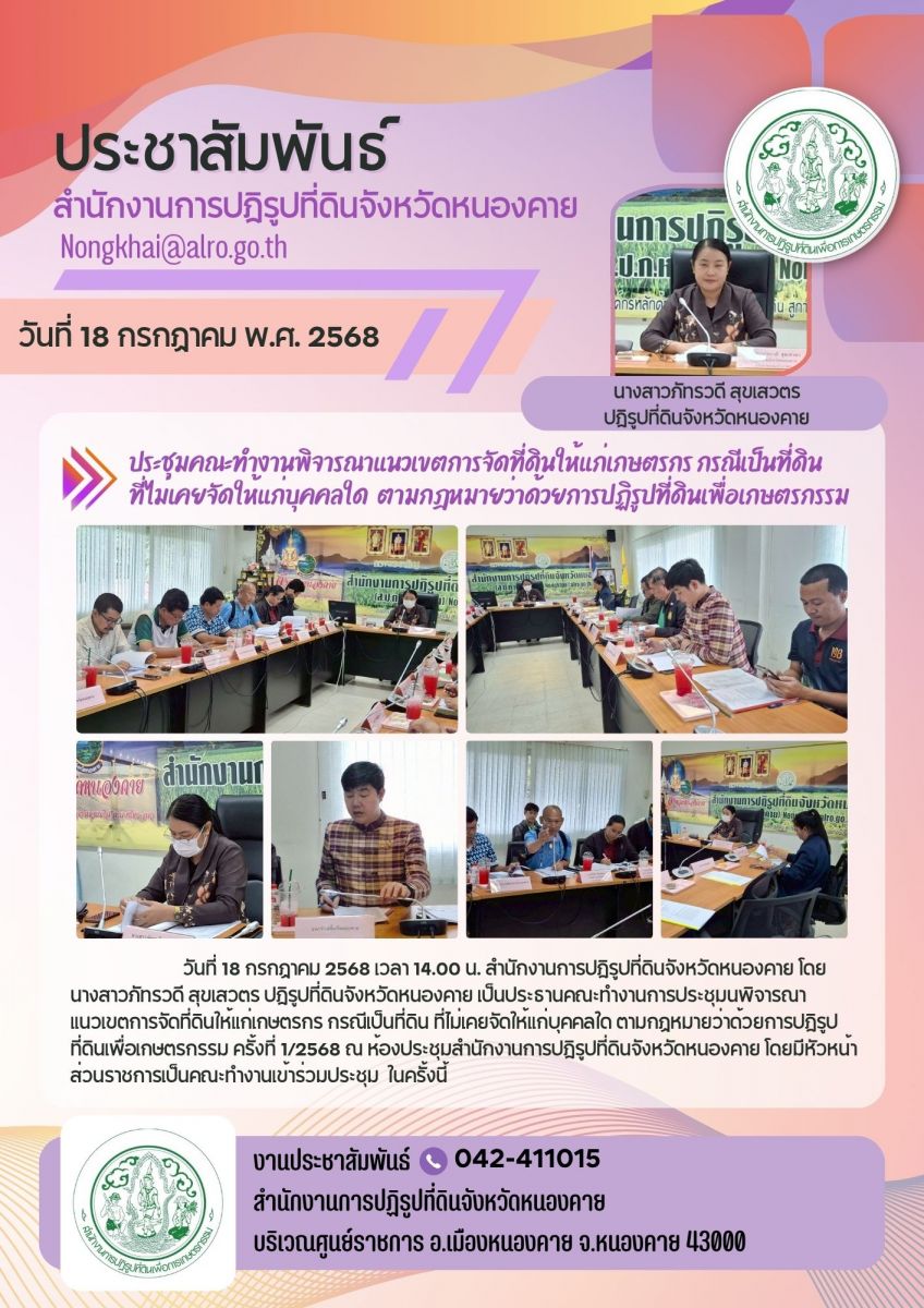 สำนักงานการปฏิรูปที่ดินจังหวัดหนองคาย จัดประชุมคณะทำงานพิจารณาแนวเขตการจัดที่ดินให้แก่เกษตรกร กรณีเป็นที่ดินที่ไม่เคยจัดให้แก่บุคคลใด ตามกฎหมายว่าด้วยการปฏิรูปที่ดินเพื่อเกษตรกรรม ครั้งที่ 1/2568