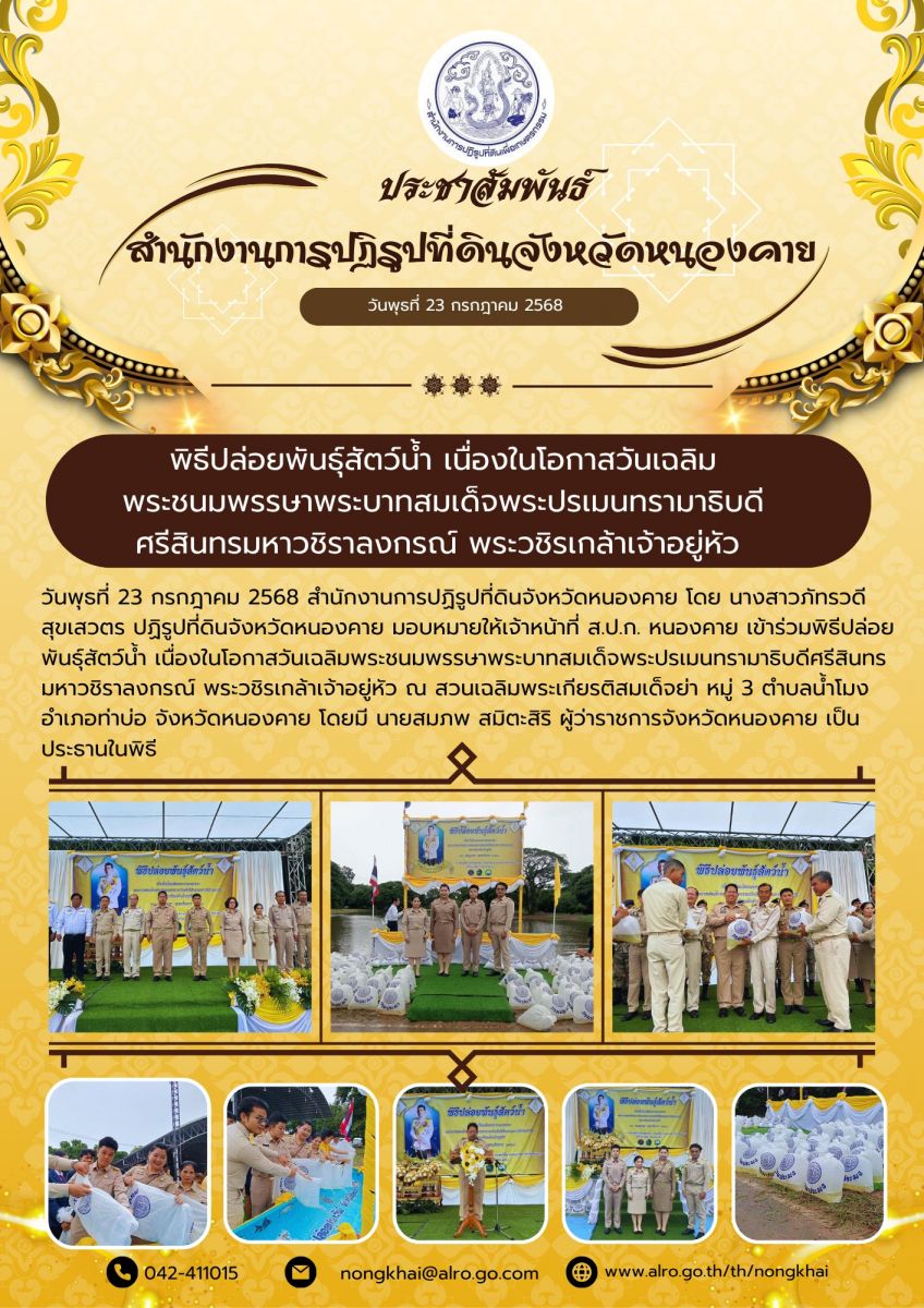 ปฏิรูปที่ดินจังหวัดหนองคาย มอบหมายเจ้าหน้าที่ ส.ป.ก.หนองคาย ร่วมพิธีปล่อยพันธุ์สัตว์น้ำ เนื่องในโอกาสวันเฉลิมพระชนมพรรษาพระบาทสมเด็จพระปรเมนทรามาธิบดีศรีสินทรมหาวชิราลงกรณ์ พระวชิรเกล้าเจ้าอยู่หัว