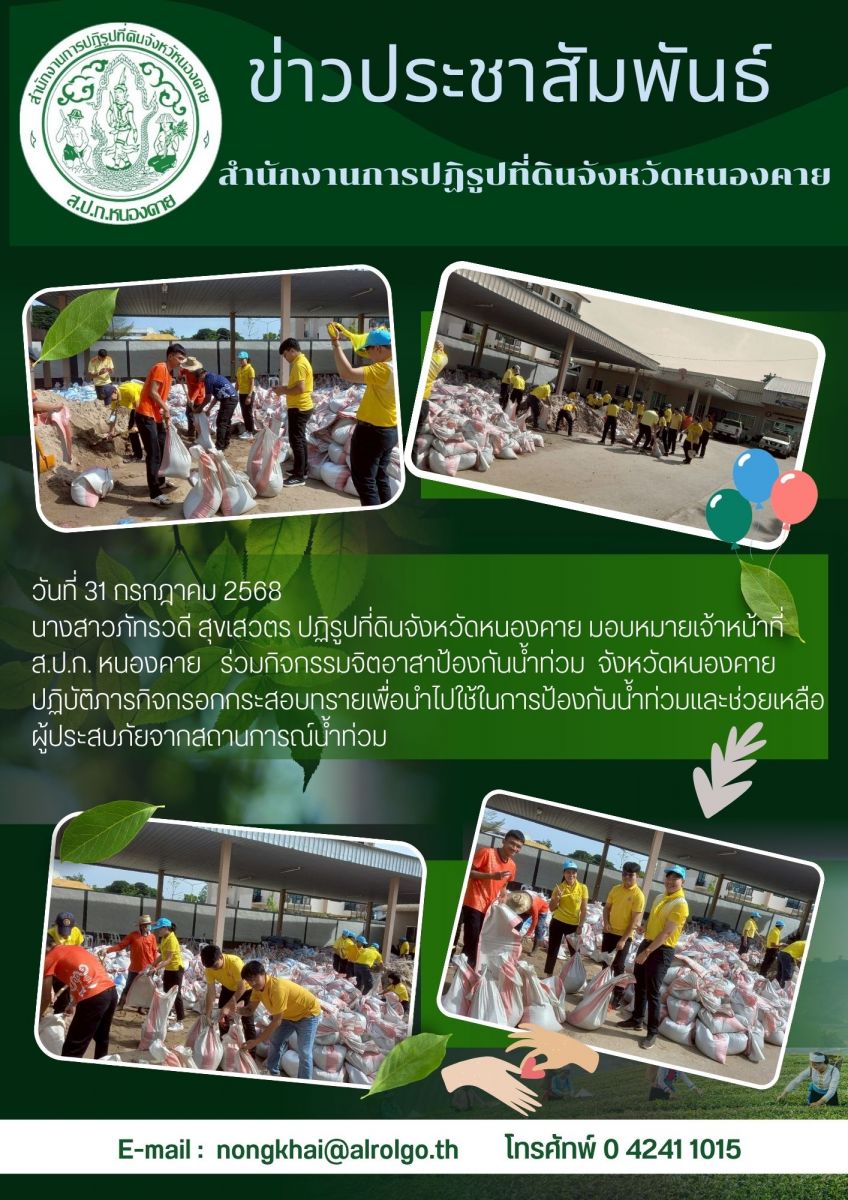 นางสาวภัทรวดี สุขเสวตร ปฏิรูปที่ดินจังหวัดหนองคาย มอบหมายเจ้าหน้าที่ ส.ป.ก.หนองคาย ร่วมกิจกรรมจิตอาสาป้องกันน้ำท่วม จังหวัดหนองคาย