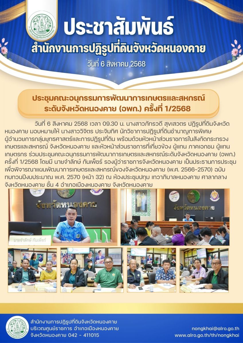 ปฏิรูปที่ดินจังหวัดหนองคาย มอบหมายนางสาววิจิตร ประจิมทิศ นักวิชาการปฏิรูปที่ดินชำนาญการพิเศษ ร่วมประชุมคณะอนุกรรมการพัฒนาการเกษตรและสหกรณ์ระดับจังหวัดหนองคาย (อกพ.) ครั้งที่ 1/2568