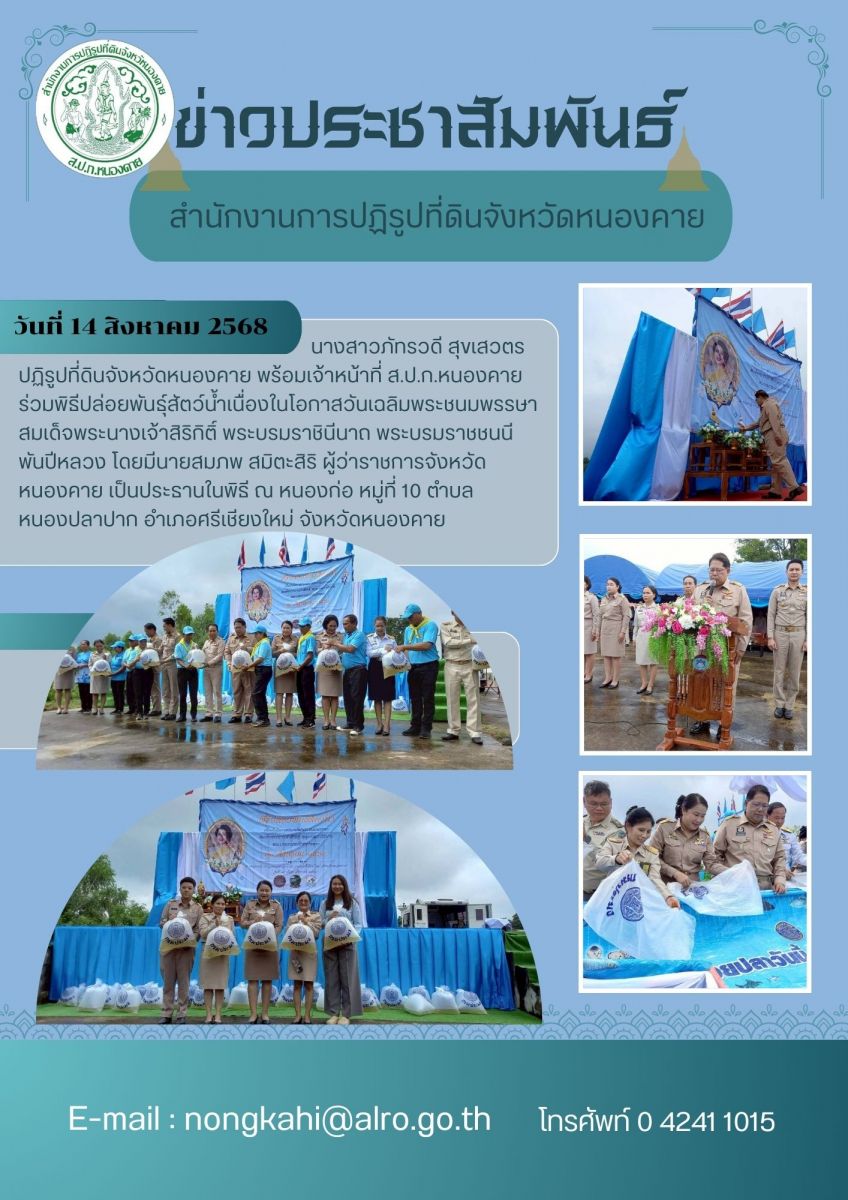 ปฏิรูปที่ดินจังหวัดหนองคาย พร้อมเจ้าหน้าที่ ร่วมพิธีปล่อยพันธุ์สัตว์น้ำเนื่องในโอกาสวันเฉลิมพระชนมพรรษาสมเด็จพระนางเจ้าสิริกิติ์ พระบรมราชินีนาถ พระบรมราชชนนีพันปีหลวง