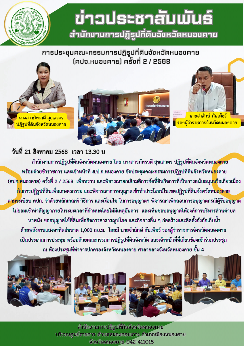 นางสาวภัทรวดี สุขเสวตร ปฏิรูปที่ดินจังหวัดหนองคาย นำทีมเจ้าหน้าที่ ส.ป.ก.หนองคาย จัดประชุมคณะกรรมการปฏฺิรูปที่ดินจังหวัดหนองคาย (คปจ.หนองคาย) ครั้งที่ 2/2568
