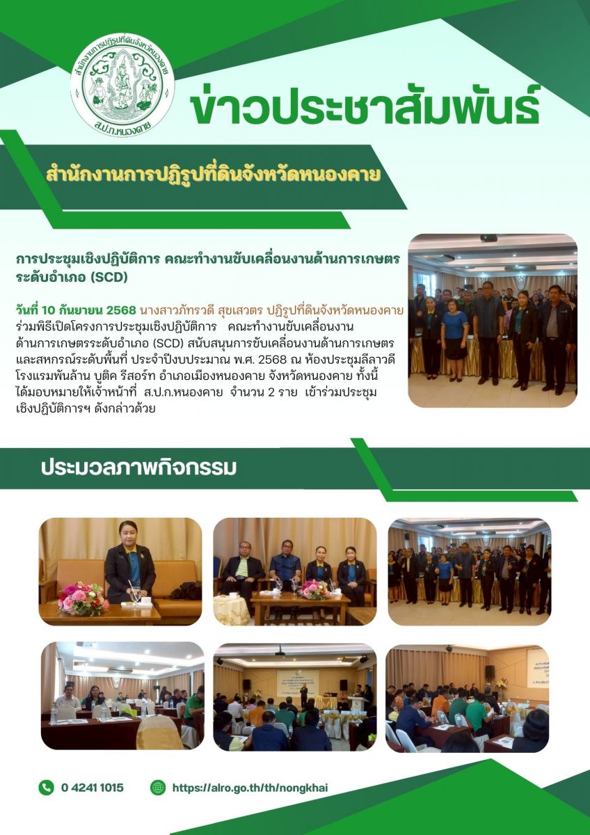 นางสาวภัทรวดี สุขเสวตร ปฏิรูปที่ดินจังหวัดหนองคาย ร่วมพิธีเปิดโครงการประชุมเชิงปฏิบัติการ คณะทำงานขับเคลื่อนงาน ด้านการเกษตรระดับอำเภอ (SCD) สนับสนุนการขับเคลื่อนงานด้านการเกษตร และสหกรณ์ระดับพื้นที่ ประจำปีงบประมาณ พ.ศ. 2568