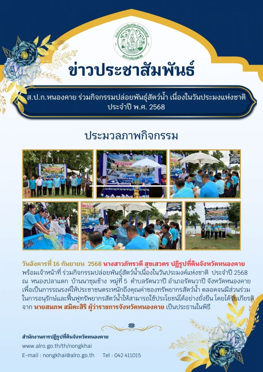 นางสาวภัทรวดี สุขเสวตร ปฏิรูปที่ดินจังหวัดหนองคาย ร่วมกิจกรรมปล่อยพันธุ์สัตว์น้ำ เนื่องในวันประมงแห่งชาติ ประจำปี พ.ศ. 2568
