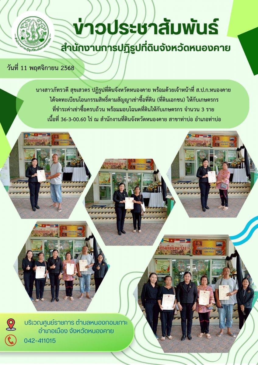 ปฏิรูปที่ดินจังหวัดหนองคาย โอนกรรมสิทธิ์มอบโฉนดที่ดินเอกชนให้แก่เกษตรกรที่ชำระค่าเช่าซื้อครบถ้วน