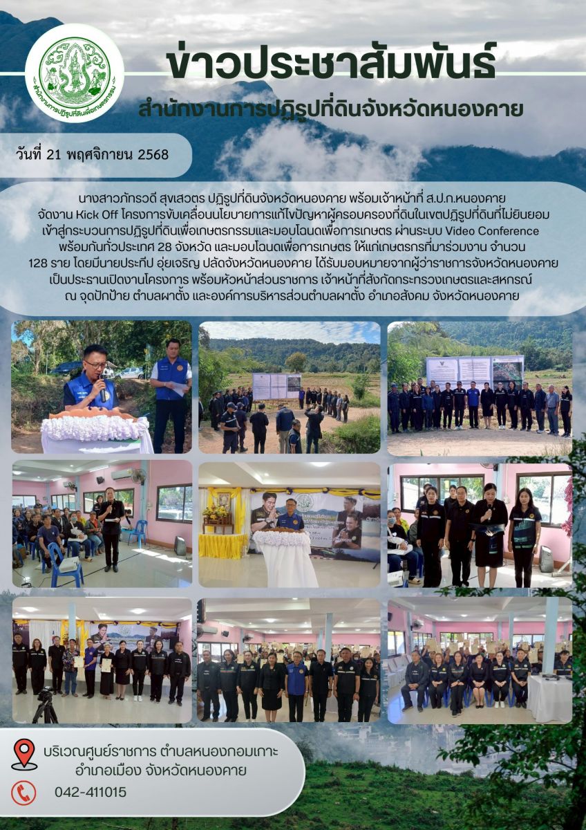 ปฏิรูปที่ดินจังหวัดหนองคาย นำทีมเจ้าหน้าที่ ส.ป.ก.หนองคาย จัดงาน KICK OFF โครงการขับเคลื่อนนโยบายการแก้ไขปัญหาการผู้ครอบครองที่ดินในเขตปฏิรูปที่ดินที่ไม่ยอมเข้าสู่กระบวนการปฏิรูปที่ดินยินยอมเข้าสู่กระบวนการปฏฺรูปที่ดินเพื่อเกษตรกรรมและมอบโฉนดเพื่อการเกษตร ผ่านระบบ Video Conference พร้อมกันทั่วประเทศ 28 จังหวัด