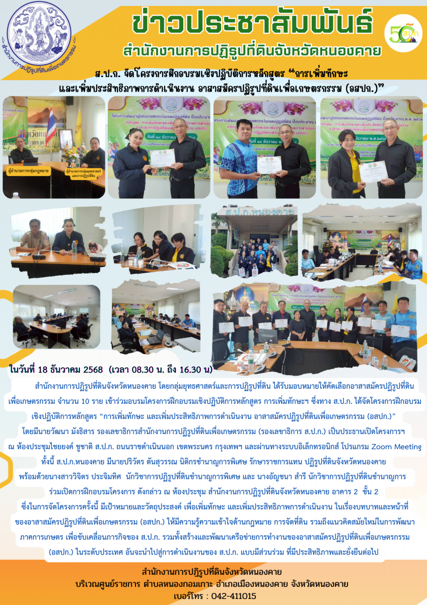 ส.ป.ก.หนองคาย นำเกษตรกรในเขตปฏิรูปที่ดินเข้าร่วมอบรมโครงการฝึกอบรมเชิงปฏิบัติการหลักสูตร "การเพิ่มทักษะและเพิ่มประสิทธิภาพการดำเนินงาน อาสาสมัครปฏิรูปที่ดินเพื่อเกษตรกรรม (อสปก.)