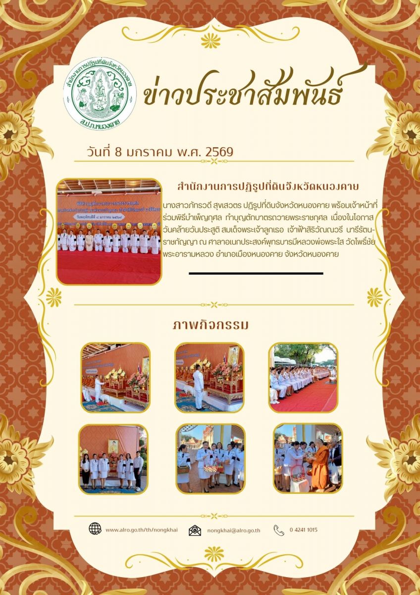 นางสาวภัทรวดี สุขเสวตร ปฏิรูปที่ดินจังหวัดหนองคาย พร้อมเจ้าหน้าที่ร่วมพิธีบำเพ็ญกุศล ทำบุญตักบาตรถวายพระราชกุศล เนื่องในโอกาสวันคล้ายวันประสูติ สมเด็จพระเจ้าลูกเธอ เจ้าฟ้าสิริวัณณวรี นารีรัตนราชกัญญา ณ ศาลาอเนกประสงค์พุทธบารมีหลวงพ่อพระใส วัดโพธิ์ชัย พระอารามหลวง อำเภอเมืองหนองคาย จังหวัดหนองคาย