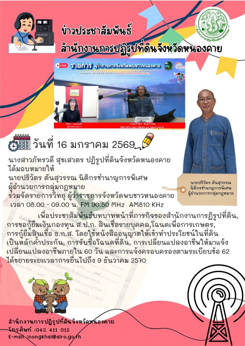 ส.ป.ก.หนองคาย ร่วมจัดรายการวิทยุ "ผู้ว่าราชการจังหวัดพบชาวหนองคาย" เพื่อประชาสัมพันธ์ภารกิจ หน้าที่ และการดำเนินงานต่าง ๆ ของ ส.ป.ก.หนองคาย ให้ประชาชนได้รับทราบโดยทั่วกัน