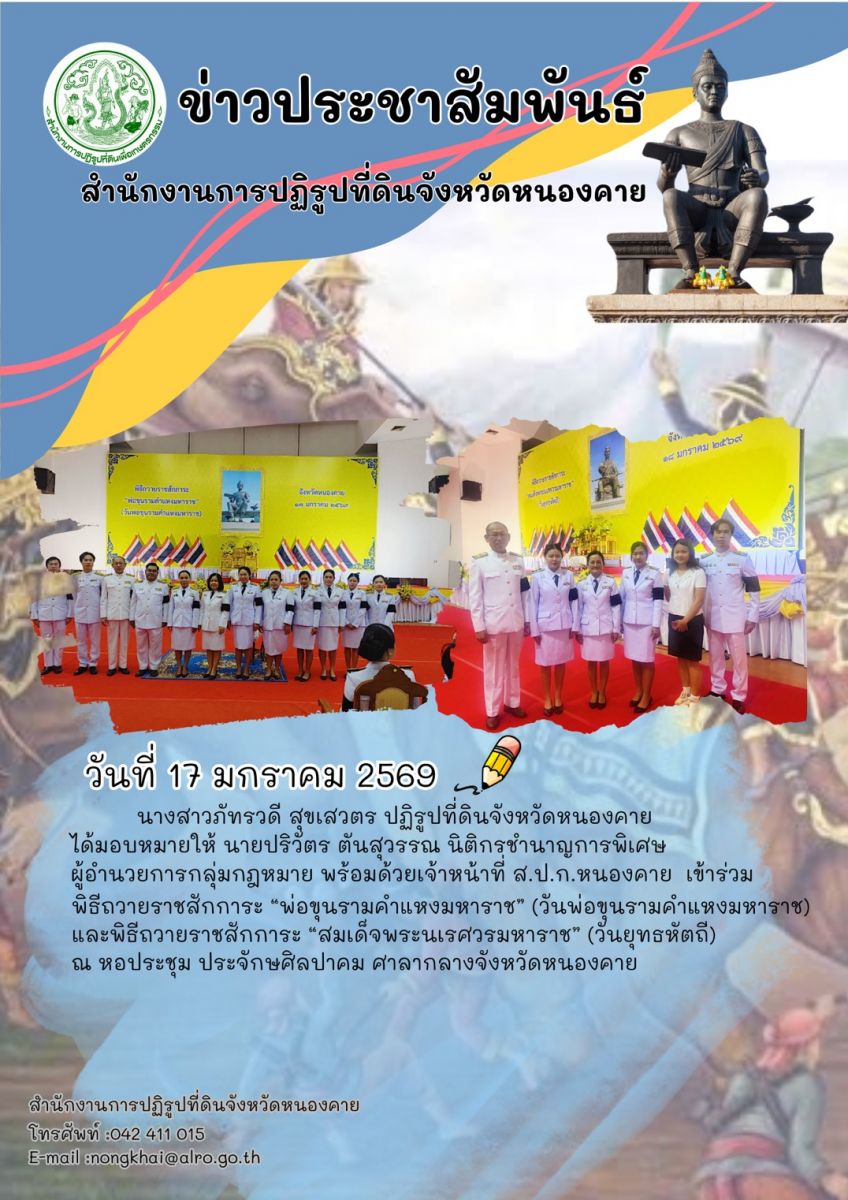 ส.ป.ก.หนองคาย ร่วมพิธีถวายราชสักการะ "สมเด็จพระนเรศวรมหาราช" (วันยุทธหัตถี) ประจำปีพุทธศักราช 2569