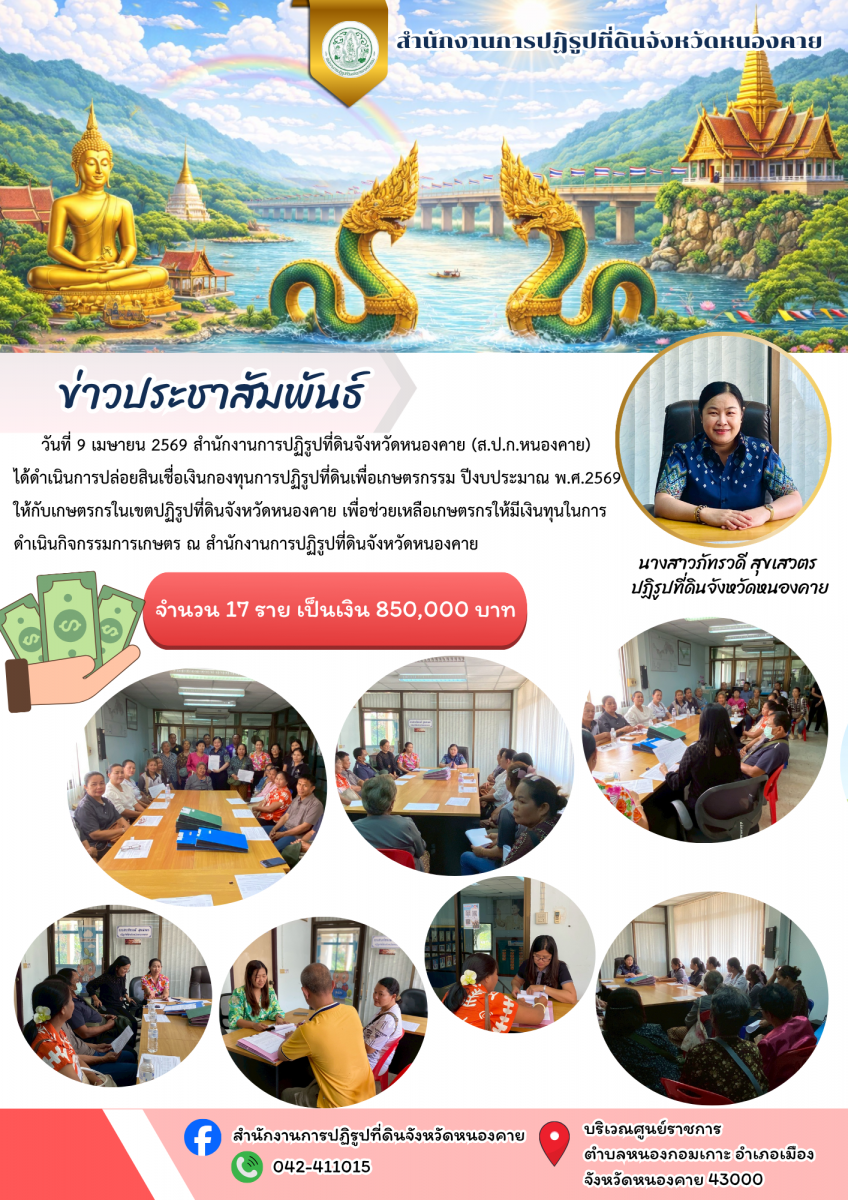 สำนักงานการปฏิรูปที่ดินจังหวัดหนองคาย ปล่อยสินเชื่อเงินกองทุนการปฏิรูปที่ดินเพื่อเกษตรกรรม ประจำปีงบประมาณ พ.ศ. 2569 ให้แก่เกษตรกร จำนวน 17 ราย จำนวนเงินรวม 850,000 บาท