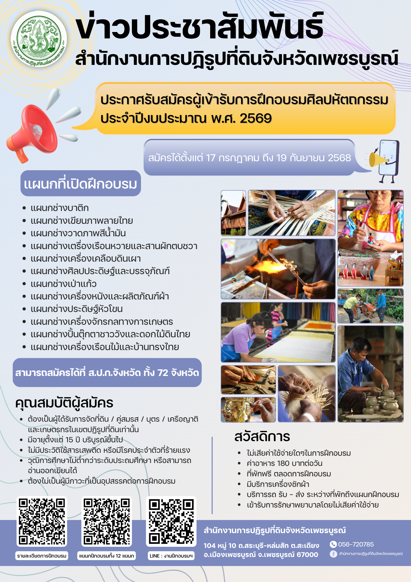 00000ศูนย์ส่งเสริมและพัฒนาอาชีพเสริมนอกภาคการเกษตร (ศพส.) ได้ดำเนินการจัดฝึกอบรมศิลปหัตถกรรม ประจำปีงบประมาณ พ.ศ. 2569 โดยหลักสูตรนี้จัดขึ้นตามแนวพระราชดำริของพระบาทสมเด็จพระชนกาธิเบศร มหาภูมิพลอดุลยเดชมหาราช บรมนาถบพิตร และสมเด็จพระนางเจ้าสิริกิติ์ พระบรมราชินีนาถ พระบรมราชชนนีพันปีหลวง เพื่อส่งเสริมการฝึกอบรมอาชีพเสริมนอกภาคการเกษตรด้านศิลปหัตถกรรมแก่เกษตรกรผู้ยากไร้ทั่วประเทศ นอกจากนี้ ยังเป็นการยกระดับทักษะและองค์ความรู้ด้านศิลปหัตถกรรมให้แก่เกษตรกร คู่สมรส เครือญาติผู้ยากไร้ ผู้พิการ และผู้ด้อยโอกาสในเขตปฏิรูปที่ดิน เพื่อพัฒนากำลังคนให้มีความเชี่ยวชาญเฉพาะด้าน พร้อมทั้งปลูกฝังคุณธรรม จริยธรรม และเจตคติที่เหมาะสม สามารถนำไปต่อยอดเป็นอาชีพเสริมและเพิ่มรายได้อย่างยั่งยืน หลักสูตรนี้ยังเปิดโอกาสให้ผู้เข้ารับการฝึกอบรมเลือกเรียนตามความสนใจ โดยเน้นภาคปฏิบัติมากกว่าภาคทฤษฎี เพื่อให้เกิดความชำนาญเฉพาะด้านอย่างแท้จริง ผู้ที่สนใจสามารถสแกน QR Code เพื่อสมัครหรือดูรายละเอียดได้เพิ่มเติม