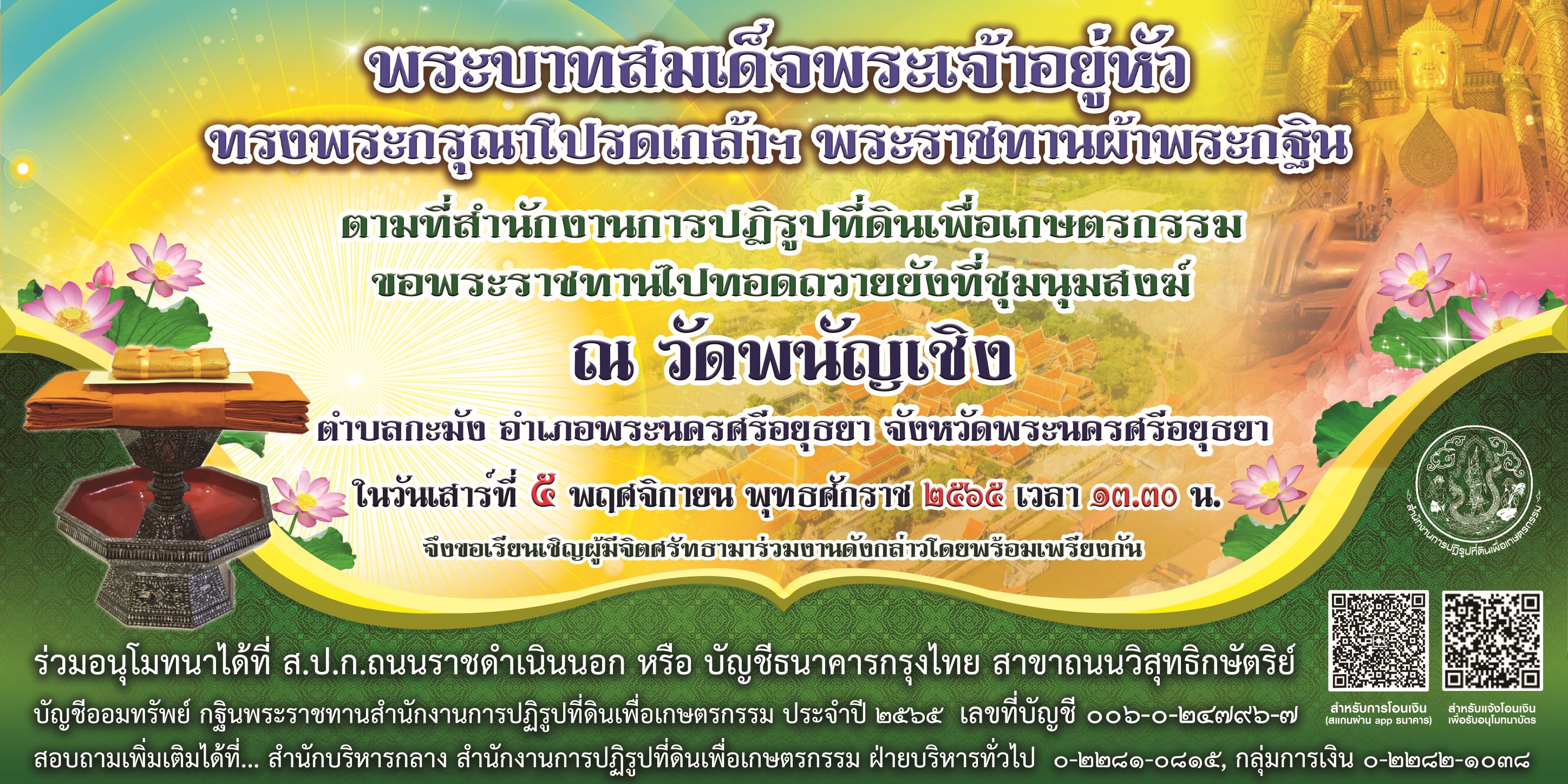 ขอเชิญร่วมทำบุญกฐินพระราชทาน สำนักงานการปฏิรูปที่ดินเพื่อเกษตรกรรม ประจำปี 2565 ในวันเสาร์ที่ 5 พฤศจิกายน 2565 ณ วัดพนัญเชิง ตำบลกะมัง อำเภอพระนครศรีอยุธยา จังหวัดพระนครศรีอยุธยา เวลา 13.30 น.