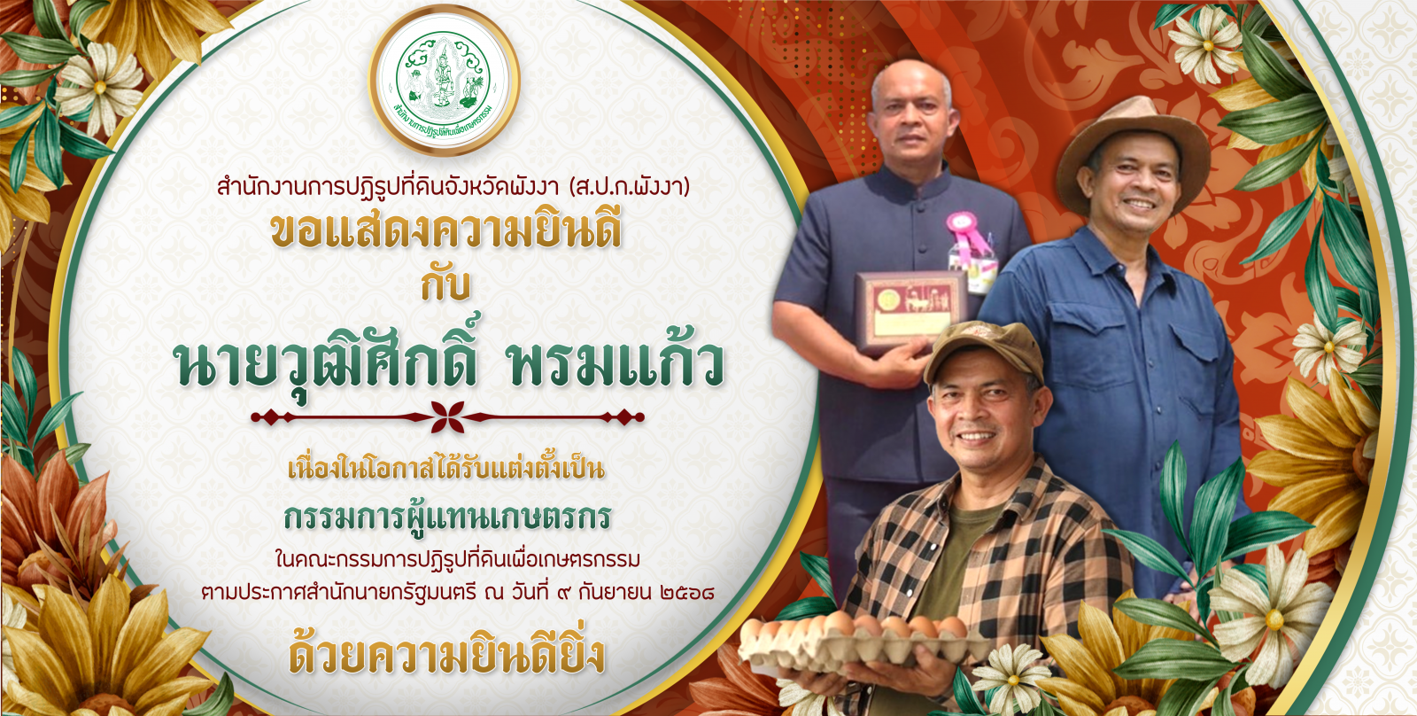 ขอแสดงความยินดีกับ นายวุฒิศักดิ์ พรมแก้ว เกษตรกรในเขตปฏิรูปที่ดินจังหวัดพังงา ได้รับตำแหน่งแต่งตั้งเป็น กรรมการผู้แทนเกษตรกร ในคณะกรรมการปฏิรูปที่ดินเพื่อเกษตรกรรม ตามประกาศสำนักนายกรัฐมนตรี ณ วันที่ 9 กันยายน 2568