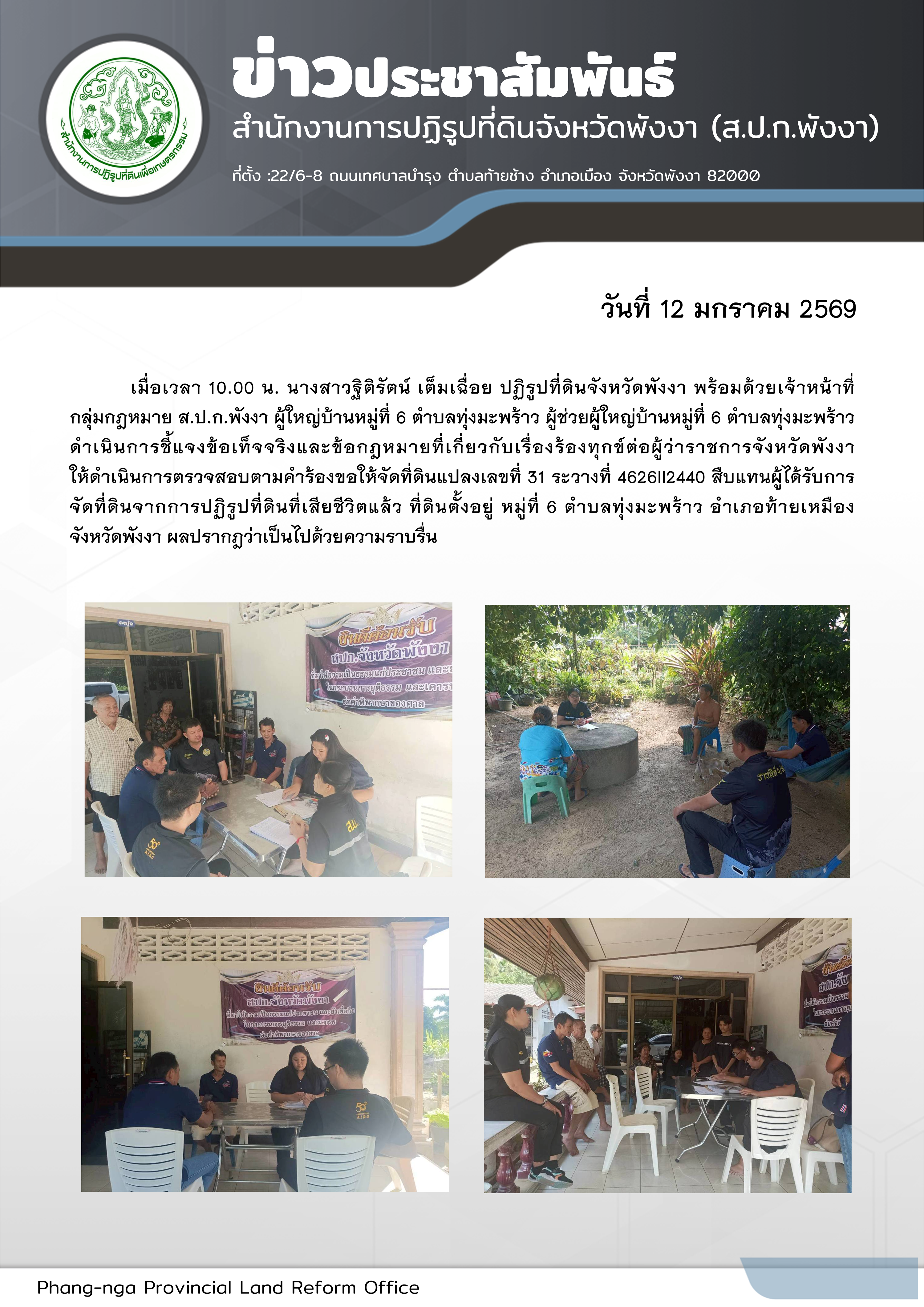 เมื่อเวลา 10.00 น. นางสาวฐิติรัตน์ เต็มเฉื่อย ปฏิรูปที่ดินจังหวัดพังงา พร้อมด้วยเจ้าหน้าที่ กลุ่มกฎหมาย ส.ป.ก.พังงา ผู้ใหญ่บ้านหมู่ที่ 6 ตำบลทุ่งมะพร้าว ผู้ช่วยผู้ใหญ่บ้านหมู่ที่ 6 ตำบลทุ่งมะพร้าว ดำเนินการชี้แจงข้อเท็จจริงและข้อกฎหมายที่เกี่ยวกับเรื่องร้องทุกข์ต่อผู้ว่าราชการจังหวัดพังงา ให้ดำเนินการตรวจสอบตามคำร้องขอให้จัดที่ดินแปลงเลขที่ 31 ระวางที่ 4626II2440 สืบแทนผู้ได้รับการ จัดที่ดินจากการปฏิรูปที่ดินที่เสียชีวิตแล้ว ที่ดินตั้งอยู่ หมู่ที่ 6 ตำบลทุ่งมะพร้าว อำเภอท้ายเหมือง จังหวัดพังงา ผลปรากฎว่าเป็นไปด้วยความราบรื่น