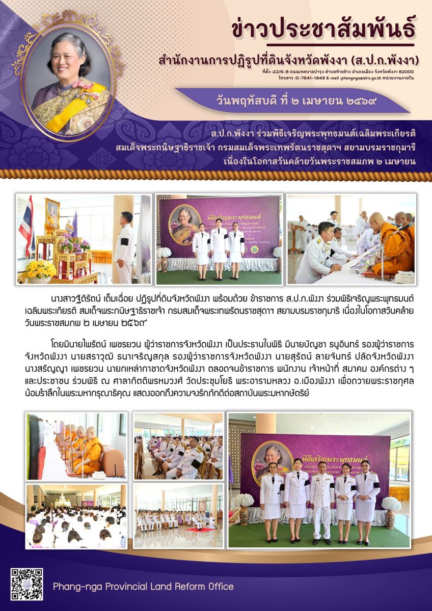 นางสาวฐิติรัตน์ เต็มเฉื่อย ปฏิรูปที่ดินจังหวัดพังงา พร้อมด้วย ข้าราชการ ส.ป.ก.พังงา ร่วมพิธีเจริญพระพุทธมนต์เฉลิมพระเกียรติ สมเด็จพระกนิษฐาธิราชเจ้า กรมสมเด็จพระเทพรัตนราชสุดาฯ สยามบรมราชกุมารี เนื่องในโอกาสวันคล้ายวันพระราชสมภพ 2 เมษายน 2569