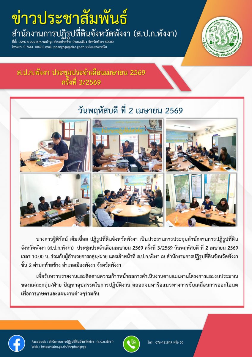 นางสาวฐิติรัตน์ เต็มเฉื่อย ปฏิรูปที่ดินจังหวัดพังงา เป็นประธานการประชุมสำนักงานการปฏิรูปที่ดินจังหวัดพังงา (ส.ป.ก.พังงา) ประชุมประจำเดือนเมษายน 2569 ครั้งที่ 3/2569 วันพฤหัสบดี ที่ 2 เมษายน 2569 เวลา 10.00 น. ร่วมกับผู้อำนวยการกลุ่ม/ฝ่าย และเจ้าหน้าที่ ส.ป.ก.พังงา ณ สำนักงานการปฏิรูปที่ดินจังหวัดพังงา ชั้น 2 ตำบลท้ายช้าง อำเภอเมืองพังงา จังหวัดพังงา