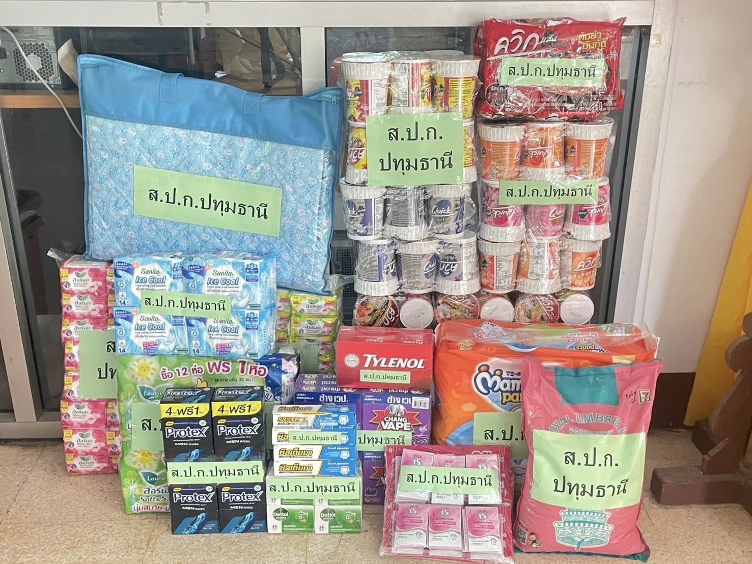 ณ ศูนย์รับบริจาคสิ่งของ อาคารศาลารักษ์ปทุม ศาลากลางจังหวัดปทุมธานี โดยมีนางสาวฐิติมา วัฒนจัง ปฏิรูปที่ดินจังหวัดปทุมธานี หัวหน้าฝ่ายและเจ้าหน้าที่ฝ่ายบริหารทั่วไป เป็นตัวแทนส่งมอบ นายสมคิด จันทมฤก ผู้ว่าราชการจังหวัดปทุมธานี พร้อมด้วย ผศ.ดร.ศศิธร จันทมฤก นายกเหล่ากาชาดจังหวัดปทุมธานี นายองครักษ์ ทองนิรมล รองผู้ว่าราชการจังหวัดปทุมธานี รับมอบ