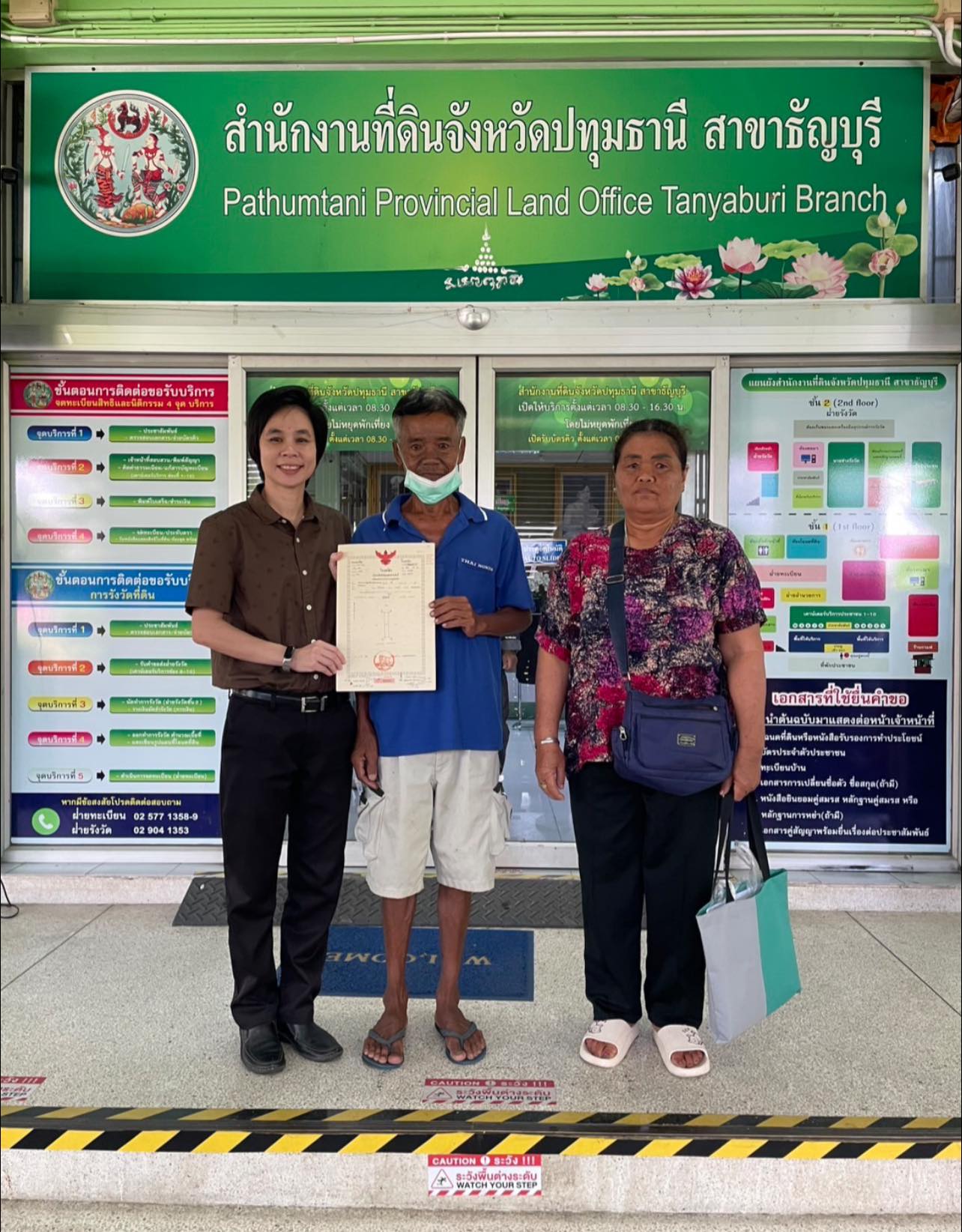 "นางสาวฐิติมา วัฒนจัง" ปฏิรูปที่ดินจังหวัดปทุมธานี พร้อมด้วยนายพีรายุทธ เณวิลัย เจ้าหน้าที่ปฏิรูปที่ดิน ยื่นจดทะเบียนสิทธิและนิติกรรมโอนที่ดินจากการเช่าซื้อให้แก่ผู้ที่ชำระค่าเช่าซื้อที่ดินครบถ้วนตามสัญญา จำนวน 3 ราย
