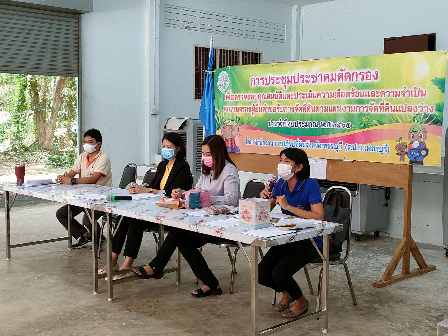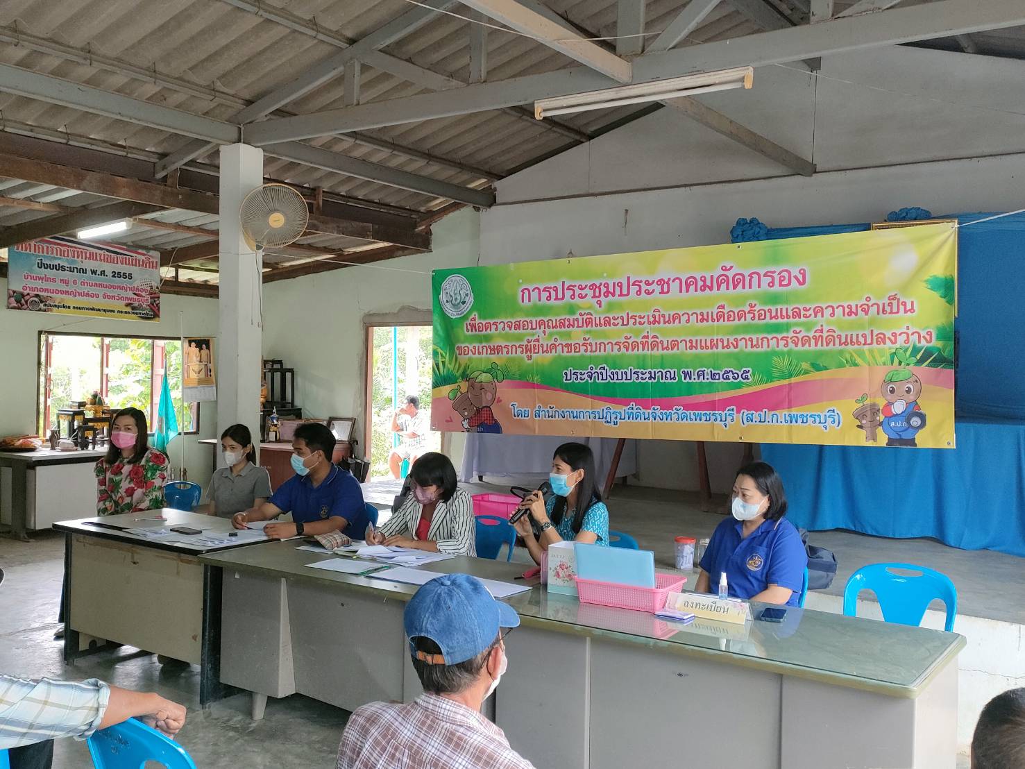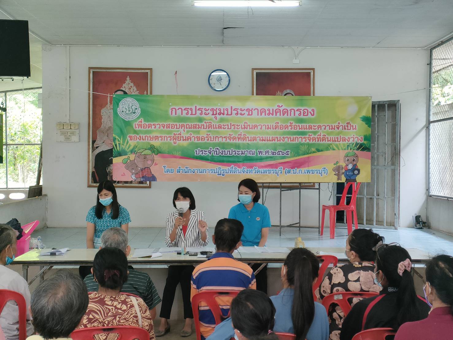 วันที่ 22-26 สิงหาคม 2565 นางสาวพอใจ คล้ายสวน ปฏิรูปที่ดินจังหวัดเพชรบุรี มอบหมายนางสาวขวัญใจ เพชรสวน ผู้อำนวยการกลุ่มยุทธศาสตร์และการปฏิรูปที่ดิน นายอดุลย์ สินธุสน ผู้อำนวยการกลุ่มการเงินบัญชีและจัดเก็บผลประโยชน์นายอดุลย์ และเจ้าหน้าที่ ส.ป.ก.เพชรบุรี จัดการประชุมประชาคมคัดกรองเพื่อตรวจสอบคุณสมบัติและประเมินความเดือดร้อนและความจำเป็นของเกษตรกรผู้ยื่นคำขอรับการจัดที่ดินตามแผนการจัดที่ดินแปลงว่าง ประจำปีงบประมาณ พ.ศ. 2565 ให้แก่เกษตรกร หมู่ 1, 2, 3, 4, 5, 8, 9, และ 10 ตำบลหนองหญ้าปล้อง และหมู่ 1, 2, 4 ตำบลยางน้ำกลัดเหนือ อำเภอหนองหญ้าปล้อง จังหวัดเพชรบุรี โดยมีเกษตรกรเข้ารับการคัดกรองจำนวน 54 ราย ณ ศาลาประชาคมประจำหมู่บ้าน ตำบลหนองหญ้าปล้อง ตำบลยางน้ำกลัดเหนือ อำเภอหนองหญ้าปล้อง จังหวัดเพชรบุรี