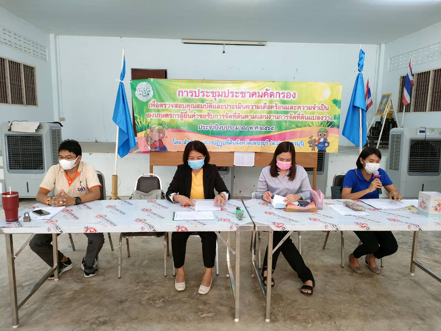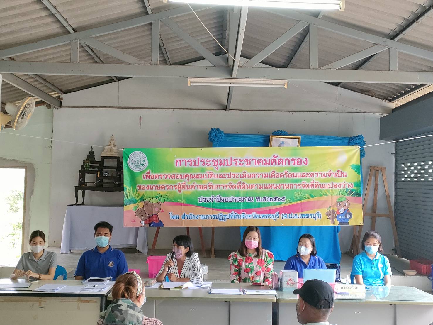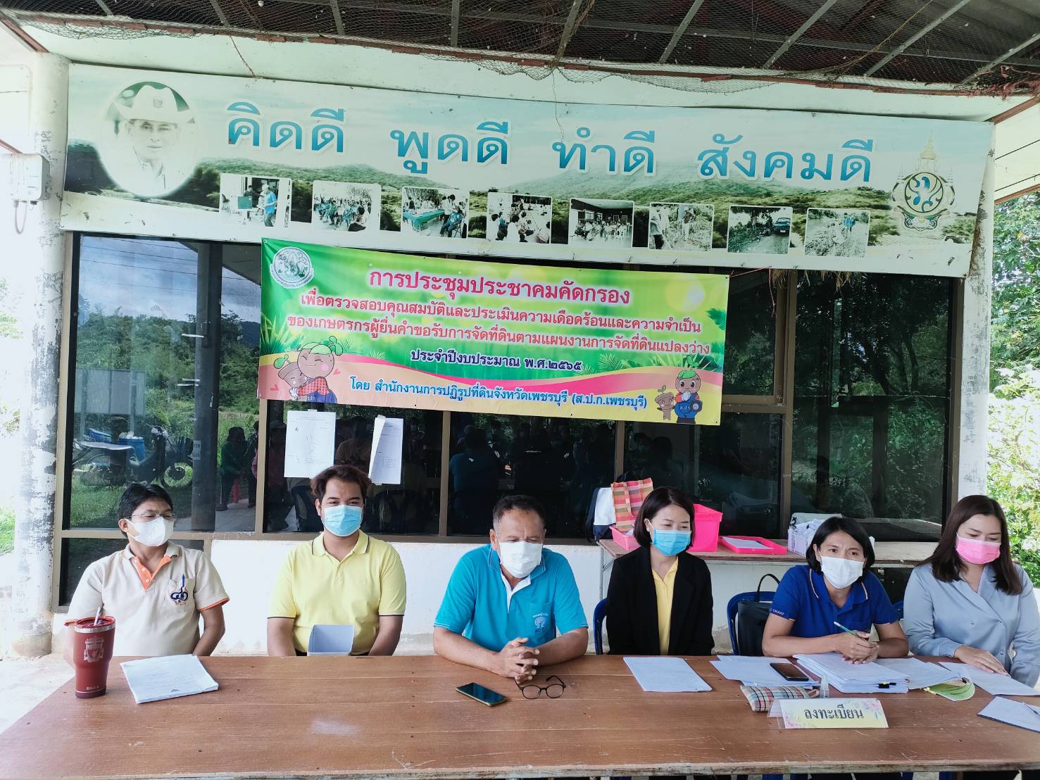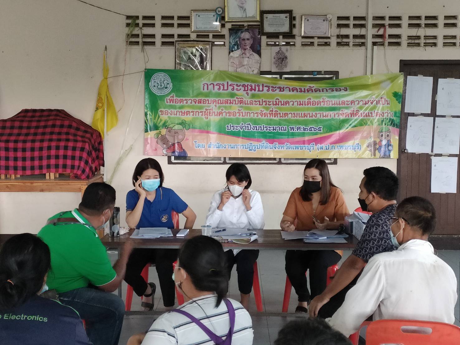 วันที่ 22-26 สิงหาคม 2565 นางสาวพอใจ คล้ายสวน ปฏิรูปที่ดินจังหวัดเพชรบุรี มอบหมายนางสาวขวัญใจ เพชรสวน ผู้อำนวยการกลุ่มยุทธศาสตร์และการปฏิรูปที่ดิน นายอดุลย์ สินธุสน ผู้อำนวยการกลุ่มการเงินบัญชีและจัดเก็บผลประโยชน์นายอดุลย์ และเจ้าหน้าที่ ส.ป.ก.เพชรบุรี จัดการประชุมประชาคมคัดกรองเพื่อตรวจสอบคุณสมบัติและประเมินความเดือดร้อนและความจำเป็นของเกษตรกรผู้ยื่นคำขอรับการจัดที่ดินตามแผนการจัดที่ดินแปลงว่าง ประจำปีงบประมาณ พ.ศ. 2565 ให้แก่เกษตรกร หมู่ 1, 2, 3, 4, 5, 8, 9, และ 10 ตำบลหนองหญ้าปล้อง และหมู่ 1, 2, 4 ตำบลยางน้ำกลัดเหนือ อำเภอหนองหญ้าปล้อง จังหวัดเพชรบุรี โดยมีเกษตรกรเข้ารับการคัดกรองจำนวน 54 ราย ณ ศาลาประชาคมประจำหมู่บ้าน ตำบลหนองหญ้าปล้อง ตำบลยางน้ำกลัดเหนือ อำเภอหนองหญ้าปล้อง จังหวัดเพชรบุรี