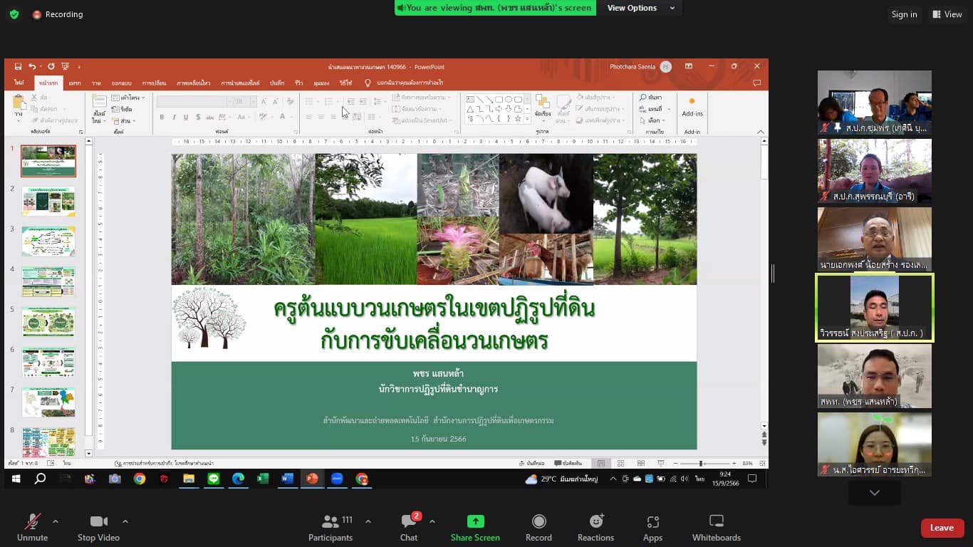 วันที่ 15 กันยายน 2566 เวลา 08.45 น. นางสาวพอใจ คล้ายสวน ปฏิรูปที่ดินจังหวัดเพชรบุรี มอบหมายนางสาวขวัญใจ วิรุฬห์ชัยพฤกษ์ นักวิชาการปฏิรูปที่ดินชำนาญการ และนางสาวเรณู นันทกิจ ครูต้นแบบวนเกษตรในเขตปฏิรูปที่ดินจังหวัดเพชรบุรี เข้าร่วมโครงการฝึกอบรมออนไลน์หลักสูตร “การสร้างและพัฒนาครูต้นแบบวนเกษตรในเขตปฏิรูปที่ดิน” ผ่านระบบประชุมทางไกลออนไลน์ (Zoom meeting) เพื่อเสริมสร้างความรู้ ทักษะในการวางแผนและประสานความร่วมมือกับภาคีต่างๆ ในการส่งเสริมวนเกษตร การเป็นผู้นำการถ่ายทอด และการสนับสนุนเพื่อยกระดับการผลิตตั้งแต่ต้นน้ำถึงปลายน้ำในการเพิ่มมูลค่าสินค้า รวมทั้งให้ครูต้นแบบสามารถเป็นกลไกในการสนับสนุน ติดตาม และประเมินผลเกษตรกรที่เข้าร่วมโครงการได้ ณ สำนักงานการปฏิรูปที่ดินจังหวัดเพชรบุรี