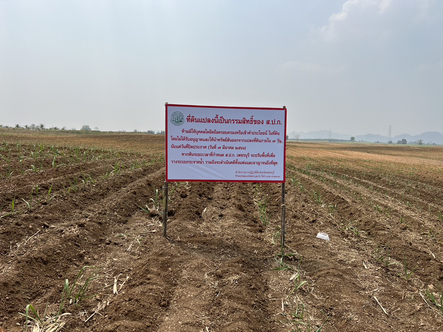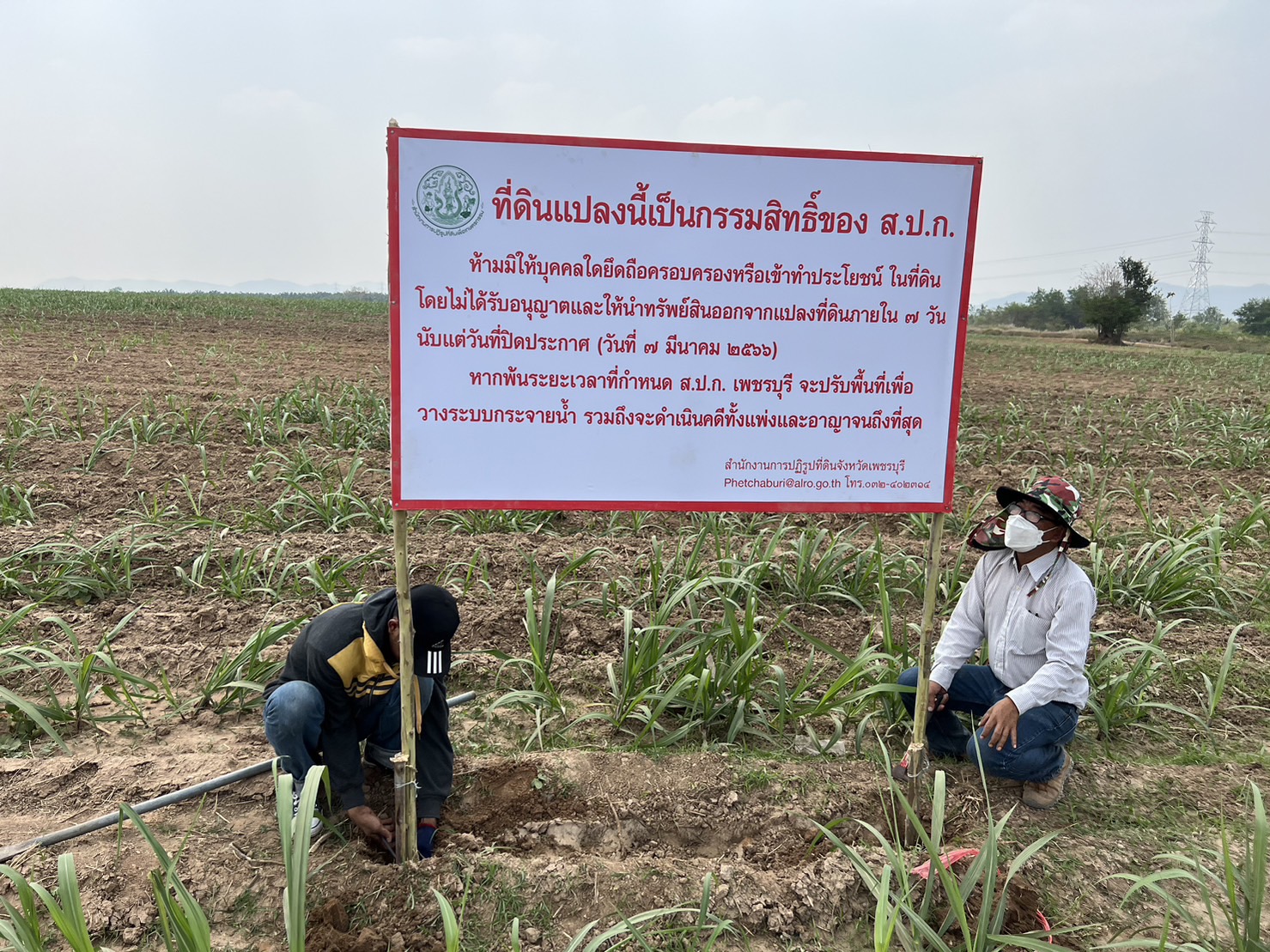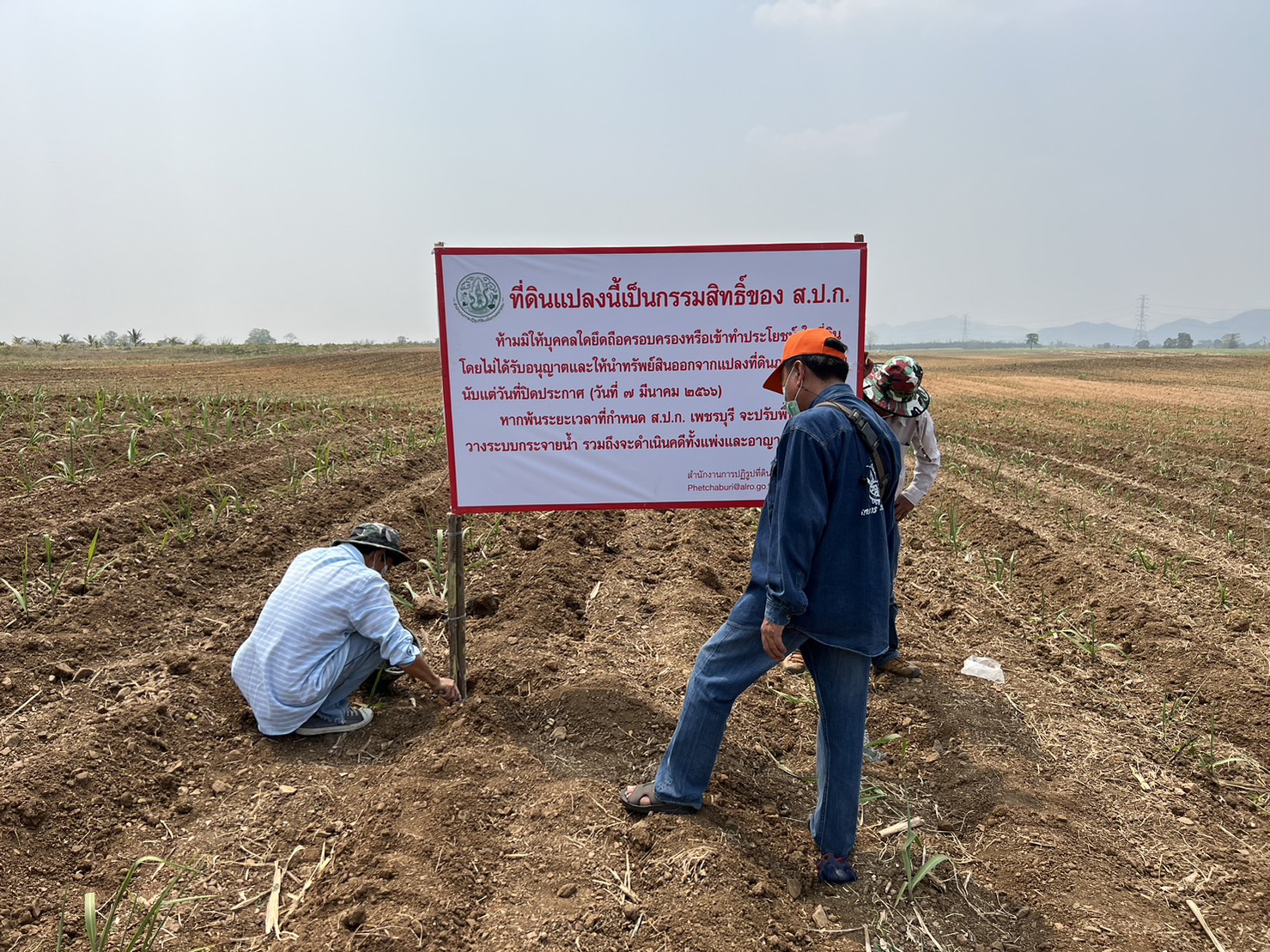 วันที่ 7 มีนาคม 2566 นางสาวพอใจ คล้ายสวน ปฏิรูปที่ดินจังหวัดเพชรบุรี มอบหมายนายศุภกิจ แก้วทรงเกษ ผู้อำนวยการกลุ่มงานช่างและแผนที่ และเจ้าหน้าที่ ส.ป.ก. เพชรบุรี ดำเนินการปักป้ายแสดงแนวเขตแปลงที่ดินกรรมสิทธิ์ของ ส.ป.ก. เพื่อป้องกันการบุกรุก ยึดถือครอบครอง หรือเข้าทำประโยชน์ในที่ดินโดยไม่ได้รับอนุญาตและให้นำทรัพย์สินออกจากแปลงที่ดินภายใน 7 วัน นับแต่วันที่ปิดประกาศ จำนวน 6 จุด ณ แปลงเกษตรกรรมพื้นที่โครงการแก้ไขปัญหาที่ดินทำกินเกษตรกรสภาประชาชน 4 ภาค ตำบลกลัดหลวง ตำบลเขากระปุก อำเภอท่ายาง จังหวัดเพชรบุรี