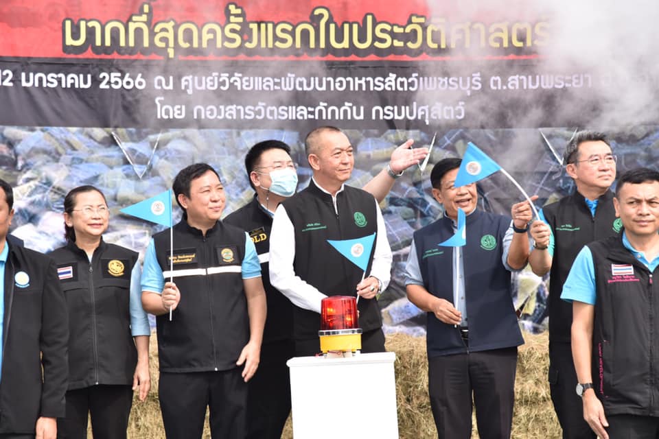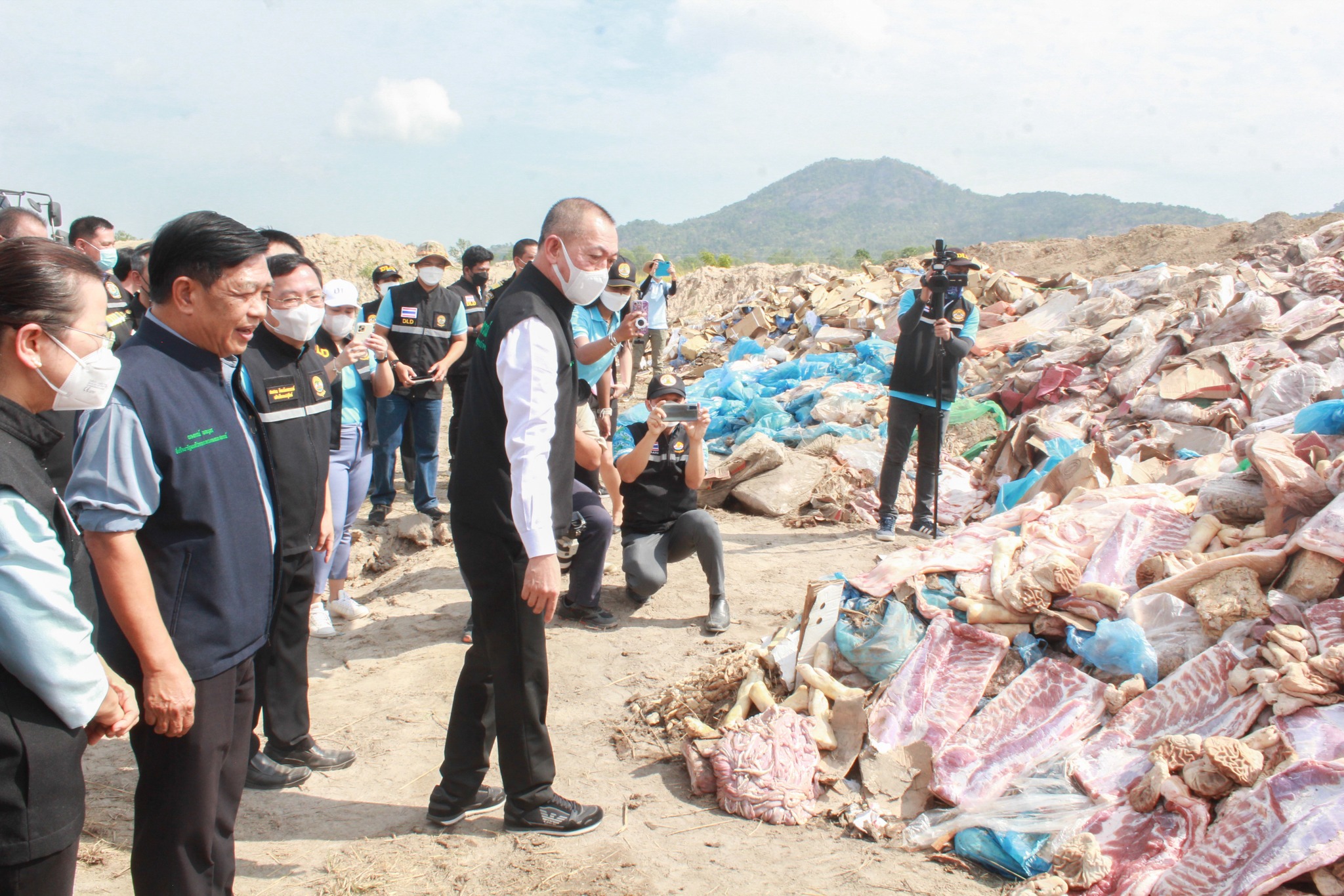 วันที่ 12 มกราคม 2566 ดร.เฉลิมชัย ศรีอ่อน รัฐมนตรีว่าการกระทรวงเกษตรและสหกรณ์ เป็นประธานในพิธีฝังทำลายชิ้นส่วนเครื่องในและเนื้อสุกรของกลางลักลอบนำเข้าผิดกฎหมาย จำนวนทั้งสิ้น 723,786 กิโลกรัม มูลค่า 123 ล้านบาท โดยมีนางวันเพ็ญ มังศรี รองผู้ว่าราชการจังหวัดเพชรบุรี กล่าวต้อนรับ นายสัตวแพทย์สมชวน รัตนมังคลานนท์ อธิบดีกรมปศุสัตว์ กล่าวรายงาน ผู้บริการกระทรวงเกษตรฯ ผู้บริหารกรมปศุสัตว์ นางสาวพอใจ คล้ายสวน ปฏิรูปที่ดินจังหวัดเพชรบุรี และเจ้าหน้าที่ที่เกี่ยวข้อง เข้าร่วมพิธีดังกล่าว ณ ศูนย์วิจัยและพัฒนาอาหารสัตว์เพชรบุรี อำเภอชะอำ จังหวัดเพชรบุรี