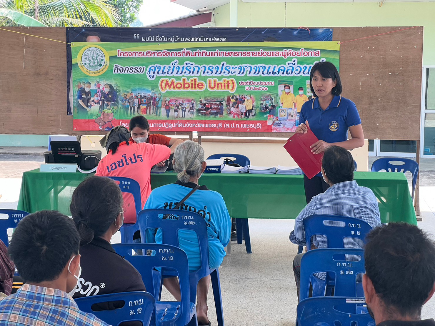 วันที่ 23 กุมภาพันธ์ 2566 นางสาวพอใจ คล้ายสวน ปฏิรูปที่ดินจังหวัดเพชรบุรี พร้อมด้วยนางสาวขวัญใจ เพชรสวน ผู้อำนวยการกลุ่มยุทธศาสตร์และการปฏิรูปที่ดิน และเจ้าหน้าที่ ส.ป.ก. เพชรบุรี ออกหน่วยให้บริการประชาชนตามโครงการบริหารจัดการที่ดินทำกินให้แก่เกษตรกรรายย่อยและผู้ด้อยโอกาส กิจกรรมศูนย์บริการประชาชนเคลื่อนที่ (Mobile Unit) ครั้งที่ 3 ประจำปีงบประมาณ พ.ศ. 2566 ให้กับเกษตรกรในเขตปฏิรูปที่ดิน อำเภอท่ายาง จังหวัดเพชรบุรี เพื่ออำนวยความสะดวกให้แก่ประชาชนในเขตปฏิรูปที่ดิน ลดภาระค่าใช้จ่ายในการเดินทางมาติดต่อเจ้าหน้าที่ ณ สถานที่ราชการ ให้บริการเกี่ยวกับ การขอรับการจัดที่ดินแทนที่กรณีสละสิทธิหรือเสียชีวิต การขึ้นทะเบียนผู้ไร้ที่ดินทำกิน การให้คำปรึกษาเกี่ยวกับกฎหมายว่าด้วยการปฏิรูปที่ดินเพื่อเกษตรกรรม การให้สินเชื่อและการกู้ยืมเงินกองทุนการปฏิรูปที่ดินเพื่อเกษตรกรรม เป็นต้น ณ ศาลาประชาคมหมู่ที่ 12 ตำบลท่าไม้รวก อำเภอท่ายาง จังหวัดเพชรบุรี โดยมีเกษตรกรเข้ารับบริการจำนวน 25 ราย