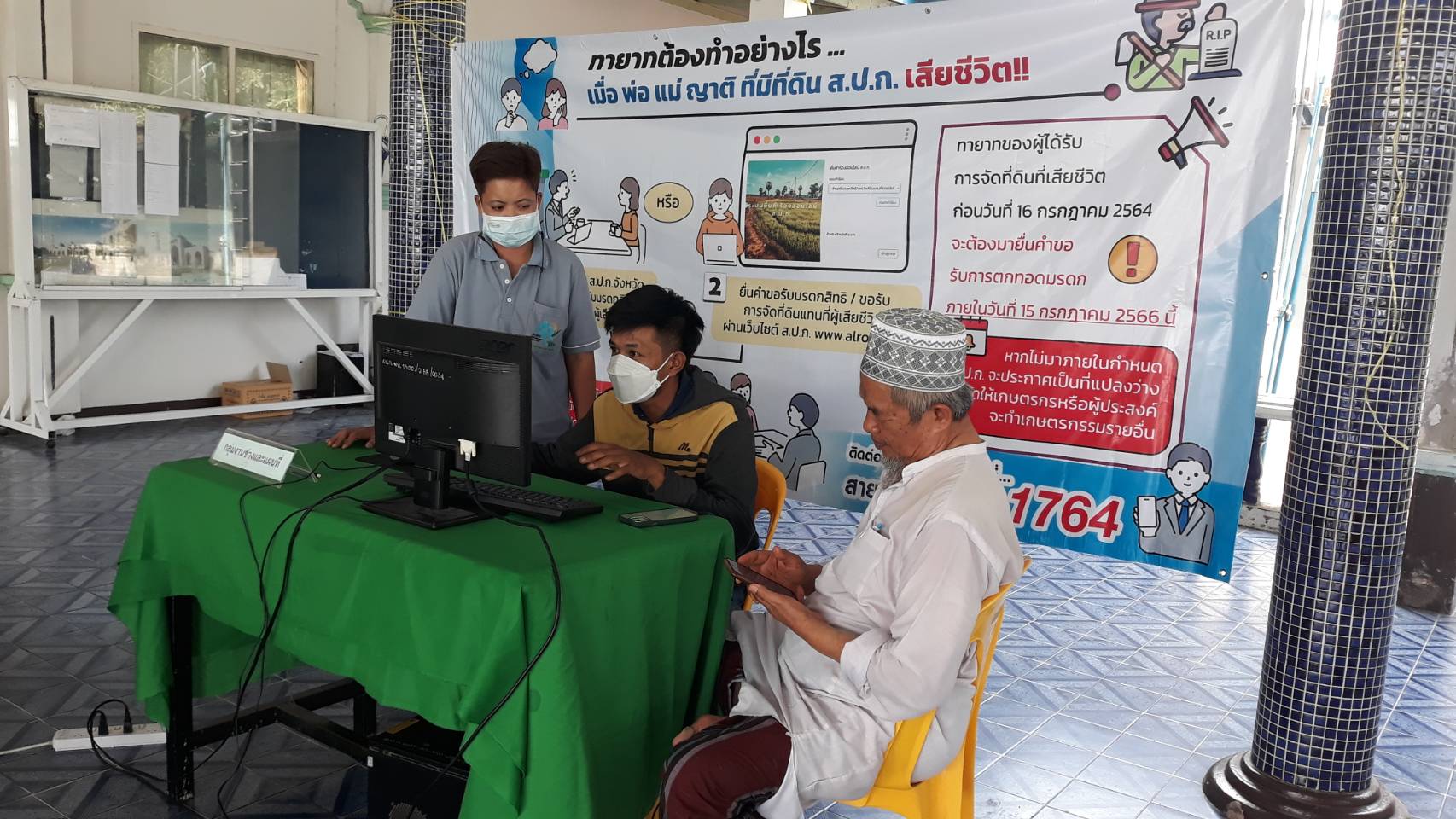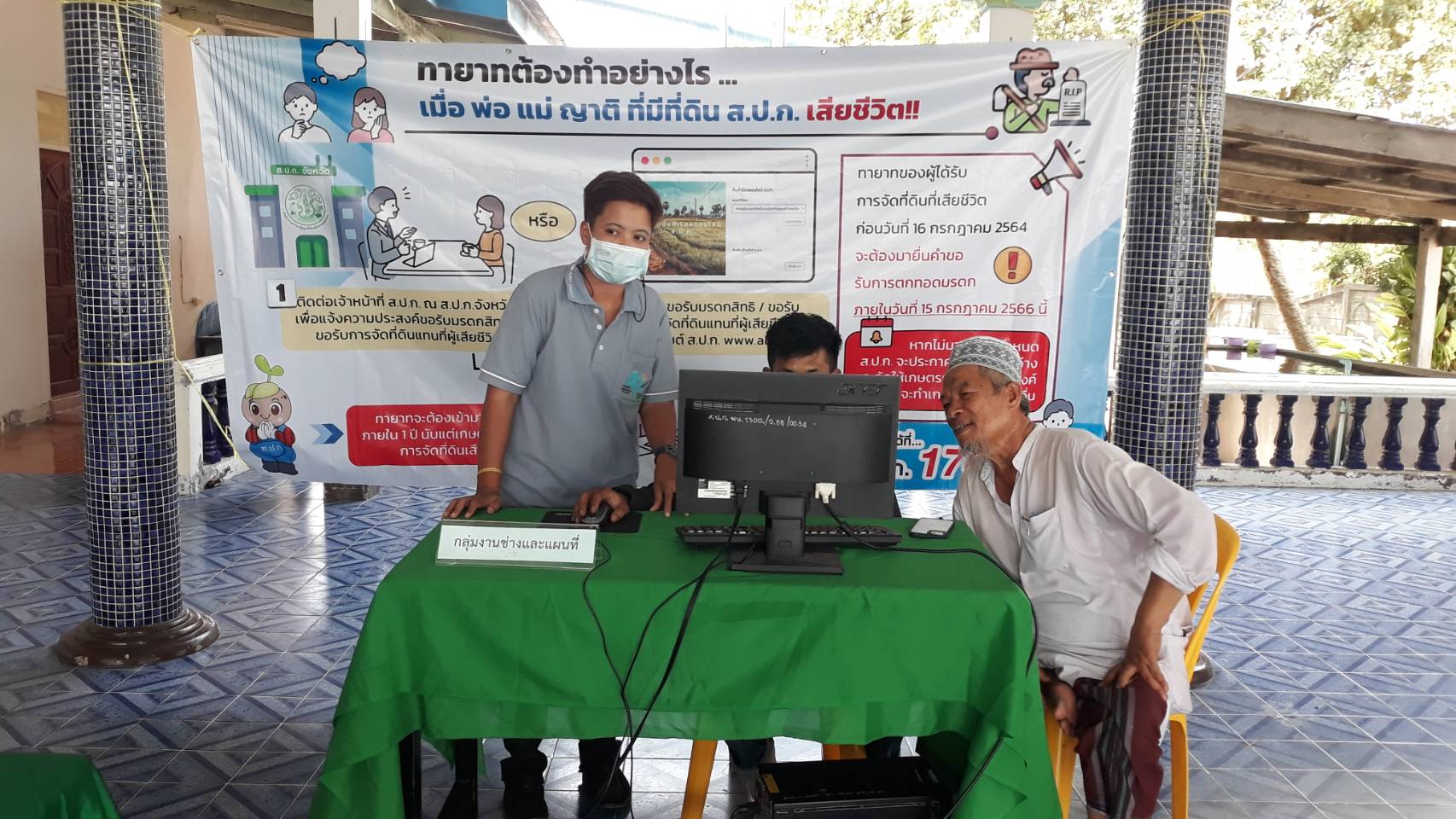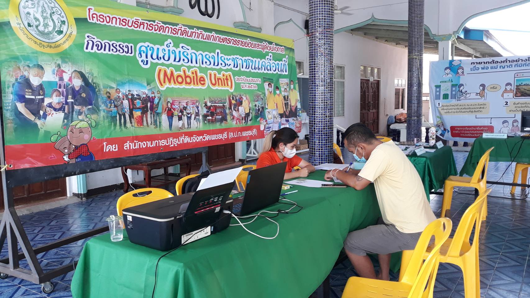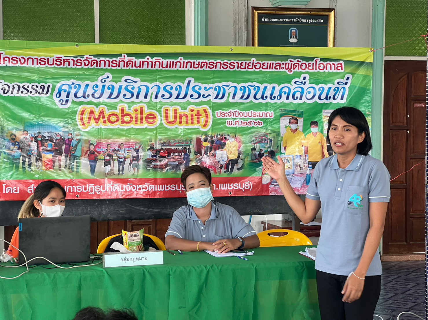 วันที่ 27 เมษายน 2566 นางสาวพอใจ คล้ายสวน ปฏิรูปที่ดินจังหวัดเพชรบุรี มอบหมายนางสาวขวัญใจ เพชรสวนผู้อำนวยการกลุ่มยุทธศาสตร์และการปฏิรูปที่ดิน และเจ้าหน้าที่ ส.ป.ก. เพชรบุรี ออกหน่วยให้บริการประชาชนตามโครงการบริหารจัดการที่ดินทำกินให้แก่เกษตรกรรายย่อยและผู้ด้อยโอกาส กิจกรรมศูนย์บริการประชาชนเคลื่อนที่ (Mobile Unit) ครั้งที่ 4 ประจำปีงบประมาณ พ.ศ. 2566 ให้กับเกษตรกรในเขตปฏิรูปที่ดิน อำเภอชะอำ จังหวัดเพชรบุรี เพื่ออำนวยความสะดวกให้แก่ประชาชนในเขตปฏิรูปที่ดิน ลดภาระค่าใช้จ่ายในการเดินทางมาติดต่อเจ้าหน้าที่ ณ สถานที่ราชการ ให้บริการเกี่ยวกับการขอรับการจัดที่ดินแทนที่กรณีสละสิทธิหรือเสียชีวิต การขึ้นทะเบียนผู้ไร้ที่ดินทำกิน การตรวจสอบแปลงที่ดินและยื่นคำขอรับการจัดที่ดิน การให้คำปรึกษาเกี่ยวกับกฎหมายว่าด้วยการปฏิรูปที่ดินเพื่อเกษตรกรรม พร้อมทั้งประชาสัมพันธ์การสมัครเข้ารับการฝึกอบรมโครงการศิลปาชีพเพื่อเกษตรกรในเขตปฏิรูปที่ดินจังหวัดเพชรบุรี และสร้างการรับรู้การลดการเผาในพื้นที่โล่งแล้งและพื้นที่เกษตรกรรม ณ มัสยิดดารุซซอลีฮีน หมู่ที่ 1 ตำบลสามพระยา อำเภอชะอำ จังหวัดเพชรบุรี โดยมีเกษตรกรเข้ารับบริการจำนวน 24 ราย