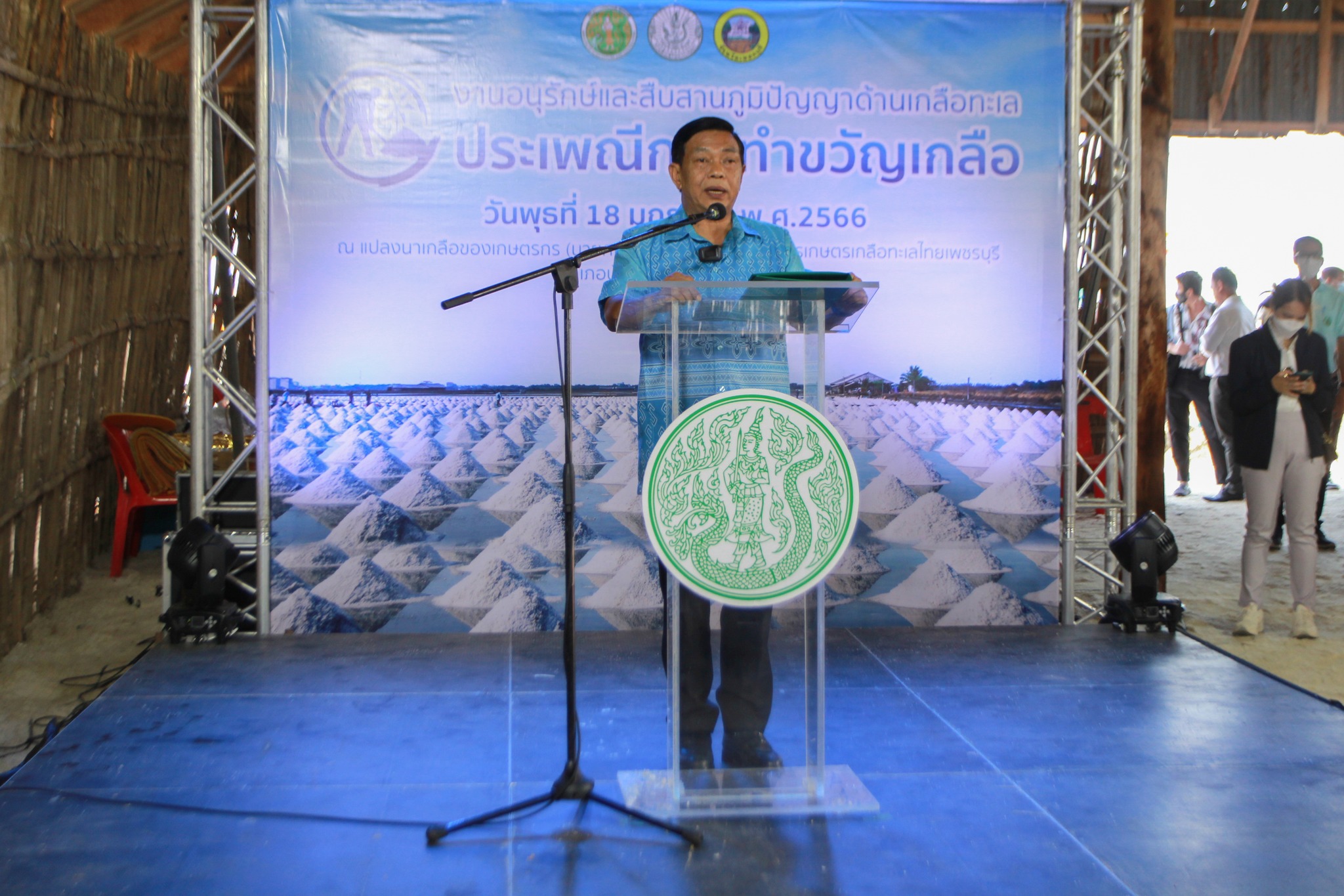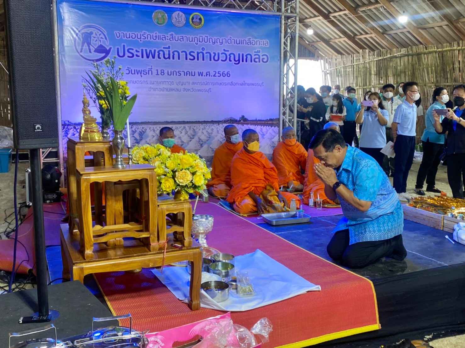 วันที่ 18 มกราคม 2566 เวลา 09.00 น. นางสาวพอใจ คล้ายสวน ปฏิรูปที่ดินจังหวัดเพชรบุรี เข้าร่วมงานอนุรักษ์และสืบสานภูมิปัญญาด้านเกลือทะเล “ประเพณีการทำขวัญเกลือ” โดยมีนายอลงกรณ์ พลบุตร ที่ปรึกษารัฐมนตรีว่าการกระทรวงเกษตรและสหกรณ์ เป็นประธานในพิธี นางวันเพ็ญ มังศรี รองผู้ว่าราชการจังหวัดเพชรบุรี กล่าวต้อนรับ และนายนวนิตย์ พลเคน รองอธิบดีกรมส่งเสริมการเกษตร กล่าวรายงาน เพื่ออนุรักษ์และสืบสานภูมิปัญญาด้านเกลือทะเล เป็นขวัญกำลังใจให้แก่เกษตรกรชาวนาเกลือในการรักษาคุณค่าทางประวัติศาสตร์วัฒนธรรมการทำนาเกลือ และกระตุ้นให้เกษตรกรพัฒนาการทำนาเกลือด้วยเทคโนโลยีนวัตกรรมและภูมิปัญญาที่มีความเหมาะสมกับ ณ แปลงนาเกลือของเกษตรกร (นายคทาวุธ บุญมา) สหกรณ์การเกษตรเกลือทะเลไทยเพชรบุรี ตำบลบ้านแหลม อำเภอบ้านแหลม จังหวัดเพชรบุรี