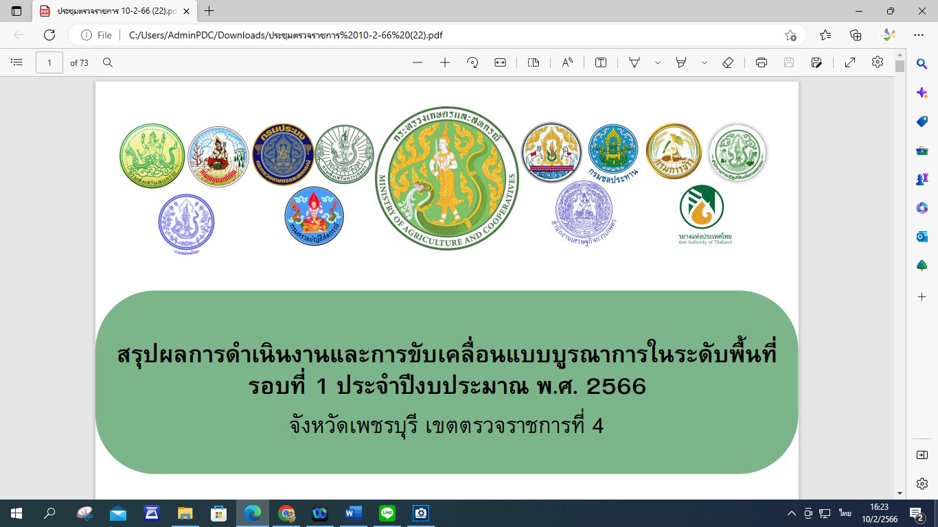 วันที่ 10 กุมภาพันธ์ 2566 นางสาวพอใจ คล้ายสวน ปฏิรูปที่ดินจังหวัดเพชรบุรี พร้อมด้วยนางสาวขวัญใจ เพชรสวน ผู้อำนวยการกลุ่มยุทธศาสตร์และการปฏิรูปที่ดิน เข้าร่วมประชุมติดตามผลการดำเนินงานตามแผนการตรวจราชการ ชี้แจงแนวทางการตรวจราชการและการขับเคลื่อนแบบบูรณาการในพื้นที่ของผู้ตรวจราชการกระทรวงเกษตรและสหกรณ์ ประจำปีงบประมาณ พ.ศ. 2566 รอบที่ 1 ของผู้ตรวจราชการกระทรวงเกษตรและสหกรณ์ (นายขจร เราประเสริฐ) รับผิดชอบตรวจราชการที่ 4, 5, 7, 12 และ 17 รับฟังผ่านสื่ออิเล็กทรอนิกส์ Zoom Cloud Meeting เพื่อรับฟังการพิจารณาสรุปผลการวิเคราะห์สภาพการผลิตและการตลาดสินค้าเกษตร ด้านพืช ด้านปศุสัตว์ และด้านประมง สรุปรายงานผลการดำเนินงานโครงการตามนโยบายสำคัญของกระทรวงเกษตรและสหกรณ์ สรุปการรายงานผลการดำเนินงานขับเคลื่อนแบบมุ่งเป้า และสรุปรายงานความก้าวหน้าการดำเนินงาน ตามแผนพัฒนาการเกษตรและสหกรณ์ระดับจังหวัด ณ ห้องประชุมสำนักงานเกษตรและสหกรณ์จังหวัดเพชรบุรี อำเภอท่ายาง จังหวัดเพชรบุรี