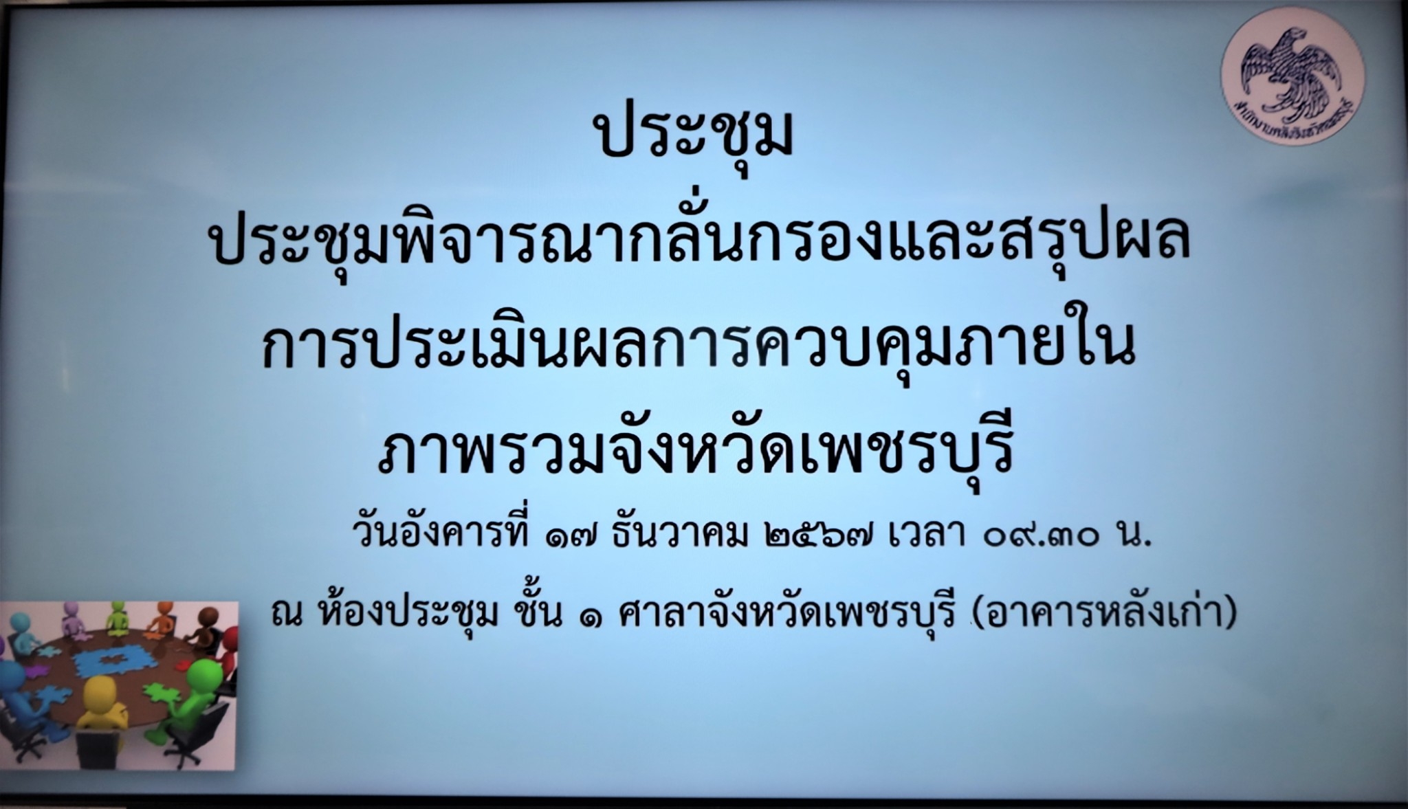 วันที่ 17 ธันวาคม 2567 เวลา 09.30 น. นางรจนพรรณ ณรงค์อินทร์ ปฏิรูปที่ดินจังหวัดเพชรบุรี มอบหมายให้ นายอดุลย์ สินธุสน ผู้อำนวยการกลุ่มการเงินบัญชีและจัดเก็บผลประโยชน์ เข้าร่วมประชุมพิจารณากลั่นกรองและสรุปผลการประเมินการควบคุมภายในภาพรวมจังหวัดเพชรบุรี โดยนางวันเพ็ญ มังศรี รองผู้ว่าราชการจังหวัดเพชรบุรี รักษาราชการแทนผู้ว่าราชการจังหวัดเพชรบุรี เป็นประธานในพิธี ณ ห้องประชุม ชั้น1 ศาลากลาง จังหวัดเพชรบุรี