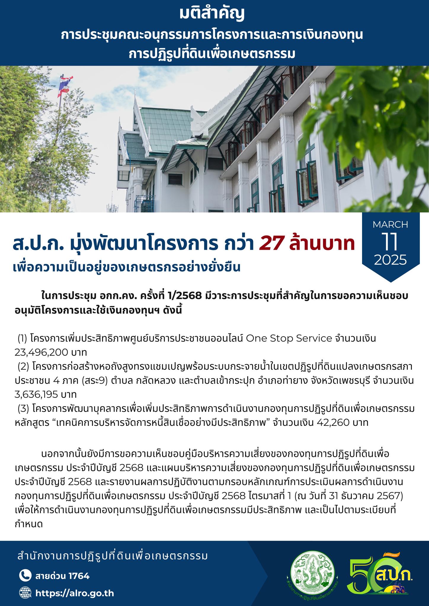 วันอังคารที่ 11 มีนาคม พ.ศ. 2568 เวลา 13.00 น. นางรจนพรรณ ณรงค์อินทร์ ปฏิรูปที่ดินจังหวัดเพชรบุรี มอบหมายให้นางสาวขวัญใจ เพชรสวน ผู้อำนวยการกลุ่มยุทธศาสตร์และการปฏิรูปที่ดิน นายศุภกิจ แก้วทรงเกษ ผู้อำนวยการกลุ่มงานช่างและแผนที่ เข้าร่วมประชุมคณะอนุกรรมการโครงการและการเงินกองทุนการปฏิรูปที่ดินเพื่อเกษตรกรรม ครั้งที่ 1/2568 ผ่านสื่ออิเล็กทรอนิกส์ โปรแกรม Zoom Meeting ณ สำนักงานการปฏิรูปที่ดินจังหวัดเพชรบุรี โดยมี นายเศรษฐเกียรติ กระจ่างวงษ์ เลขาธิการสำนักงานการปฏิรูปที่ดินเพื่อเกษตรกรรม (ส.ป.ก.) เป็นประธานการประชุม ในส่วนของ ส.ป.ก.เพชรุบุรี ได้รับอนุมัติงบประมาณเพื่อดำเนินโครงการก่อสร้างหอถังสูงทรงแชมเปญพร้อมระบบกระจายน้ำในเขตปฏิรูปที่ดินแปลงเกษตรกรสภาประชาชน 4 ภาค (สระ 9 ) ตำบลกลัดหลวง และตำบลเขากระปุก อำเภอท่ายาง จังหวัดเพชรบุรี
