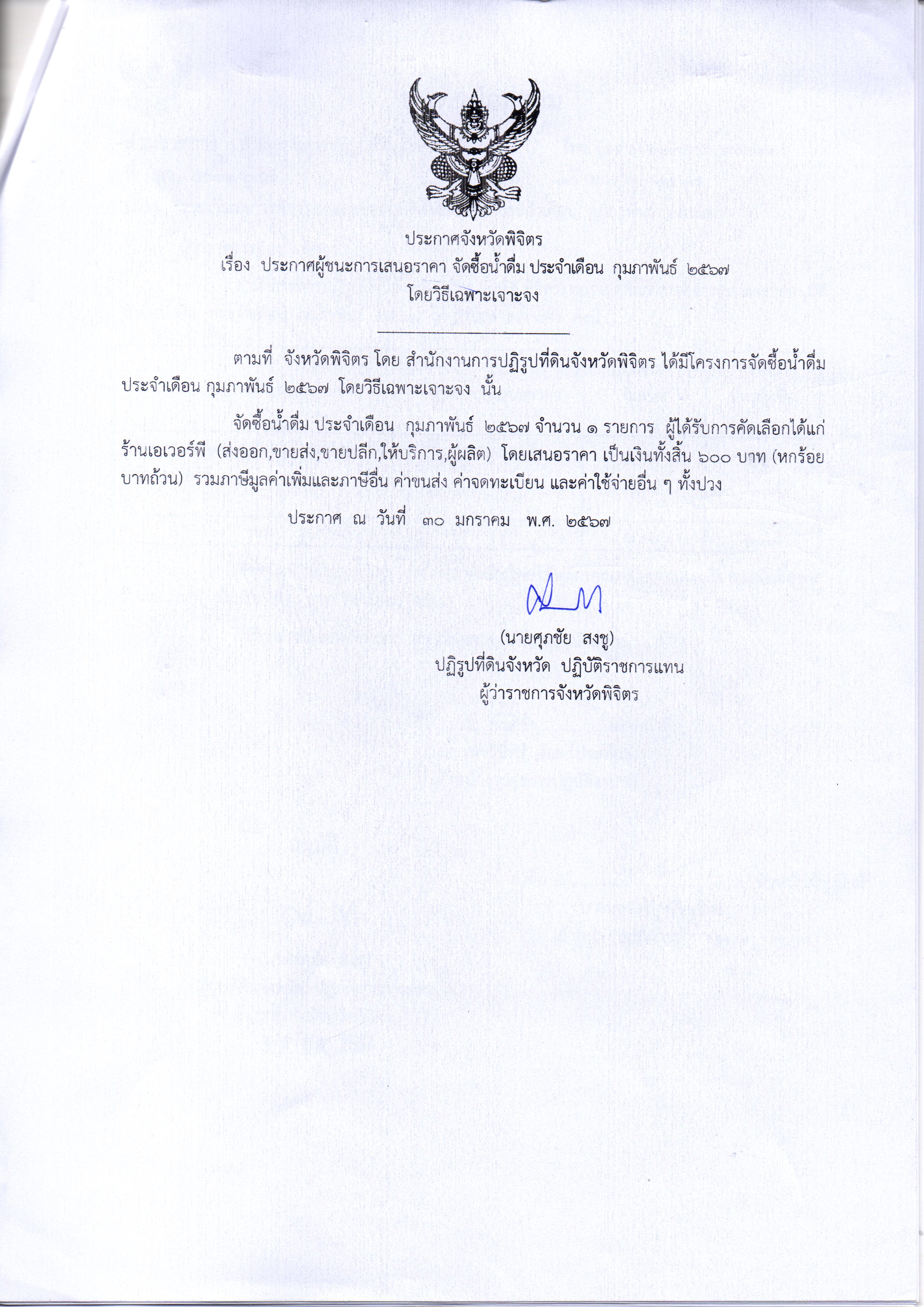 ประกาศผู้ชนะการเสนอราคา จัดซื้อน้ำดื่ม ประจำเดือนกุมภาพันธ์ 2567 โดยวิธีเฉพาะเจาะจง