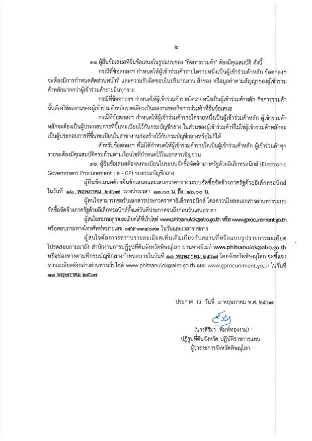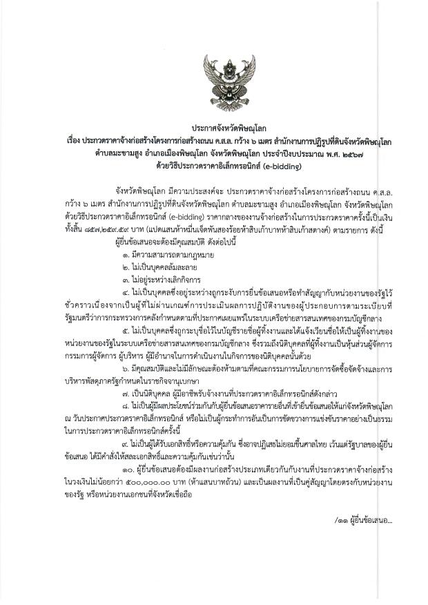 ประกาศจังหวัดพิษณุโลก เรื่อง ประกวดราคาจ้างก่อสร้างโครงการก่อสร้างถนน ค.ส.ล. กว้าง 6 เมตร สำนักงานการปฏิรูปที่ดินจังหวัดพิษณุโลก ตำบลมะขามสูง อำเภอเมืองพิษณุโลก จังหวัดพิษณุโลก ประจำปีงบประมาณ พ.ศ. ๒๕๖7 ด้วยวิธีประกวดราคาอิเล็กทรอนิกส์ (e-bidding)