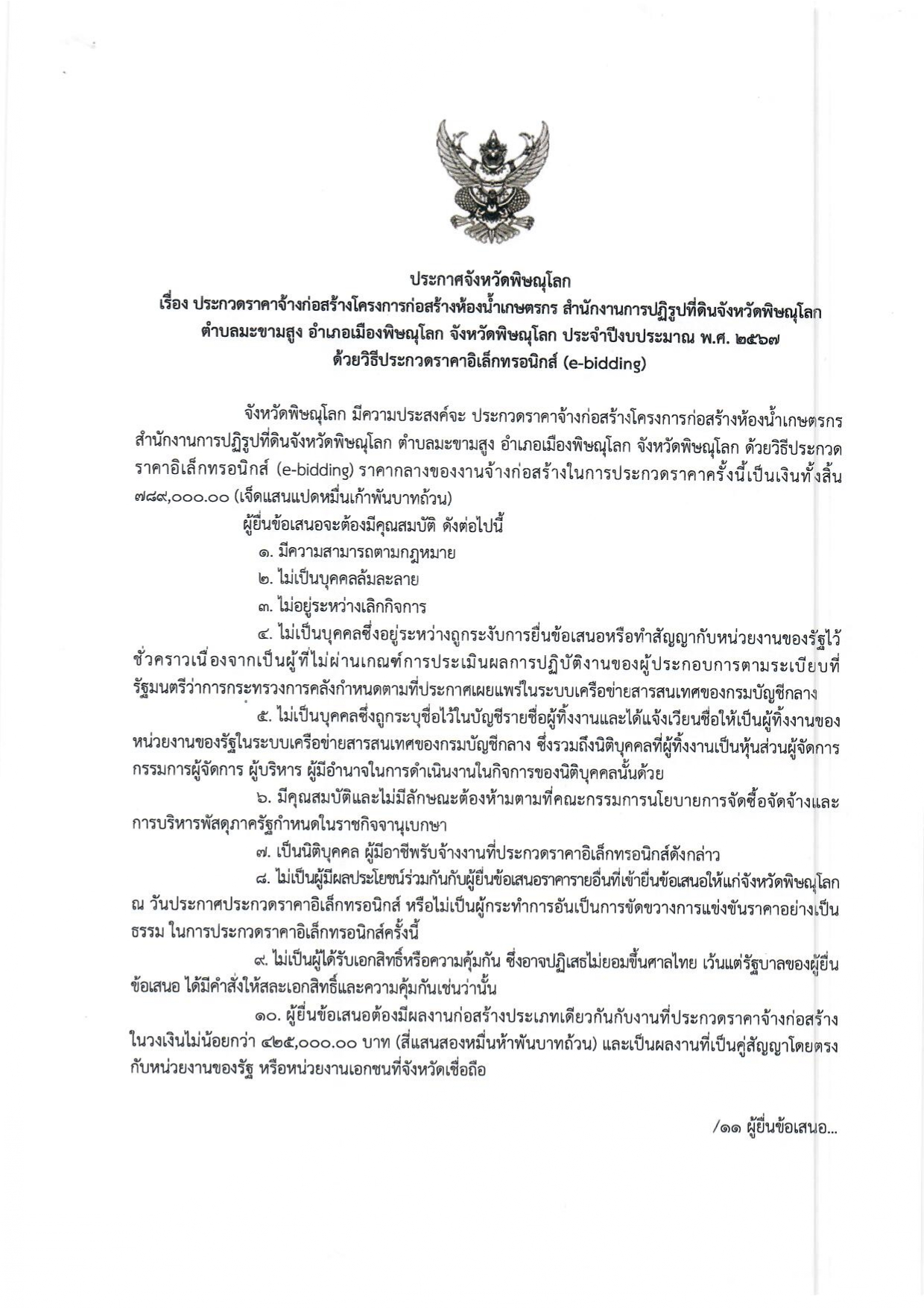 ประกาศจังหวัดพิษณุโลก เรื่อง ประกวดราคาจ้างก่อสร้างโครงการก่อสร้างห้องน้ำเกษตรกร สำนักงานการปฏิรูปที่ดินจังหวัดพิษณุโลก ตำบลมะขามสูง อำเภอเมืองพิษณุโลก จังหวัดพิษณุโลก ประจำปีงบประมาณ พ.ศ. ๒๕๖๗ ด้วยวิธีประกวดราคาอิเล็กทรอนิกส์ (e-bidding)