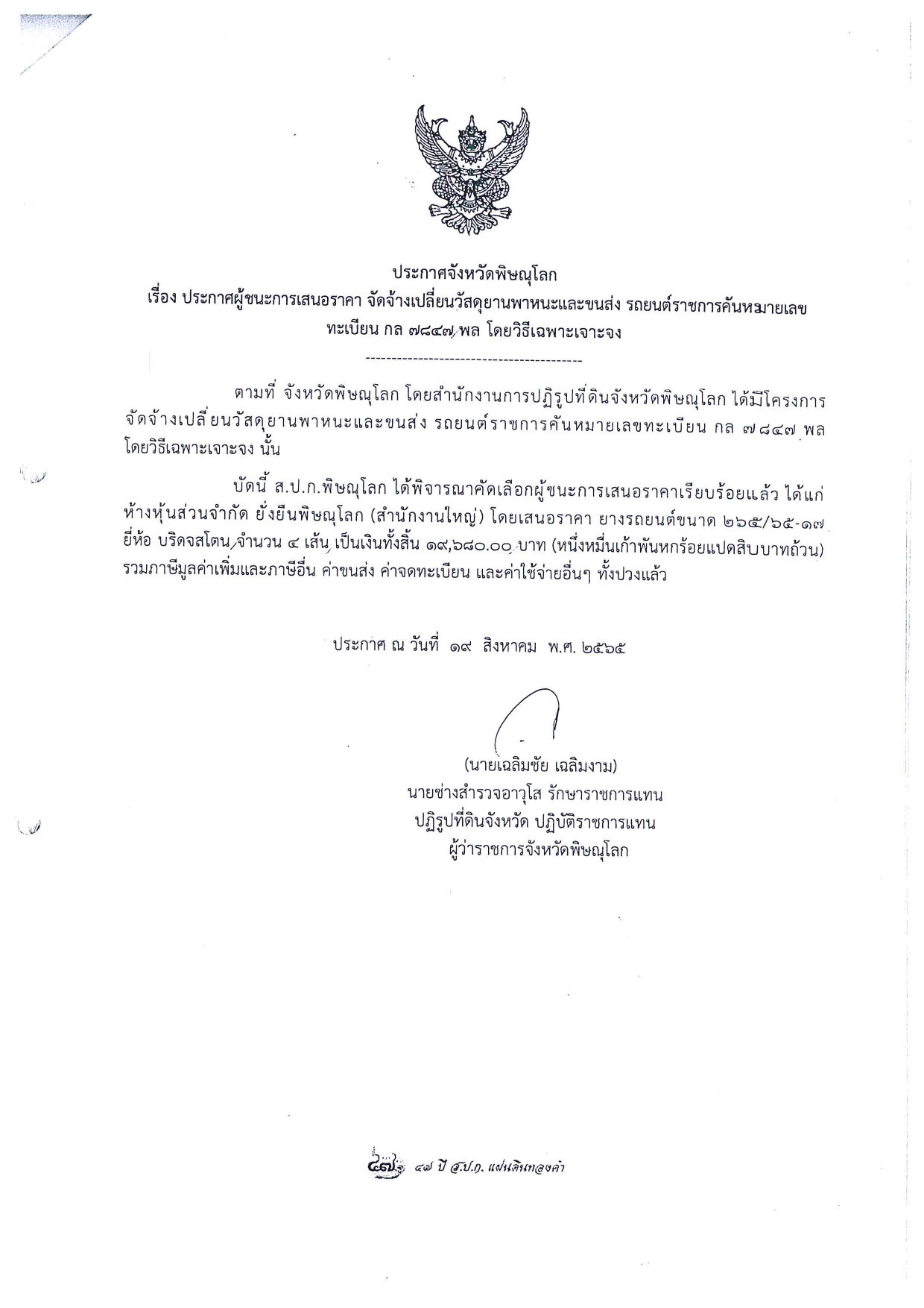 ประกาศจังหวัดพิษณุโลก เรื่อง ประกาศผู้ชนะการเสนอราคา จัดจ้างเปลี่ยนวัสดุยานพาหนะและขนส่ง รถยนต์ราชการคันหมายเลขทะเบียน กล 7847 พล โดยวิธีเฉพาะเจาะจง