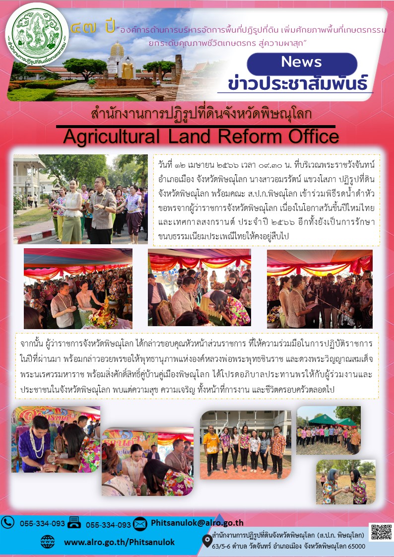 เมื่อเวลา 09.30 น. วันที่ 12 เมษายน 2566 บริเวณพระราชวังจันทน์ อำเภอเมือง จังหวัดพิษณุโลก นางสาวอมรรัตน์ แขวงโสภา ปฏิรูปที่ดินจังหวัดพิษณุโลก พร้อมคณะ ส.ป.ก.พิษณุโลก เข้าร่วมพิธีรดน้ำดำหัว ขอพรจากผู้ว่าราชการจังหวัดพิษณุโลก เนื่องในโอกาสวันขึ้นปีใหม่ไทยและเทศกาลสงกรานต์ ประจำปี 2566 อีกทั้งยังเป็นการรักษาขนบธรรมเนียมประเพณีไทยให้คงอยู่สืบไป