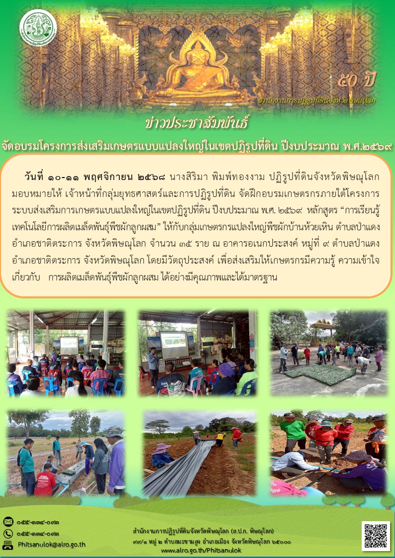 วันที่ 10-11 พฤศจิกายน 2568 นางสิริมา พิมพ์ทองงาม ปฏิรูปที่ดินจังหวัดพิษณุโลก มอบหมายให้ เจ้าหน้าที่กลุ่มยุทธศาสตร์และการปฏิรูปที่ดิน จัดฝึกอบรมเกษตรกรภายใต้โครงการระบบส่งเสริมการเกษตรแบบแปลงใหญ่ในเขตปฏิรูปที่ดิน ปีงบประมาณ พ.ศ. ๒๕๖๙ หลักสูตร “การเรียนรู้เทคโนโลยีการผลิตเมล็ดพันธุ์พืชผักลูกผสม” ให้กับกลุ่มเกษตรกรแปลงใหญ่พืชผักบ้านห้วยเหิน ตำบลป่าแดง อำเภอชาติตระการ จังหวัดพิษณุโลก จำนวน 35 ราย ณ อาคารอเนกประสงค์ หมู่ที่ 9 ตำบลป่าแดง อำเภอชาติตระการ จังหวัดพิษณุโลก โดยมีวัตถุประสงค์ เพื่อส่งเสริมให้เกษตรกรมีความรู้ ความเข้าใจ เกี่ยวกับ การผลิตเมล็ดพันธุ์พืชผักลูกผสม ได้อย่างมีคุณภาพและได้มาตรฐาน