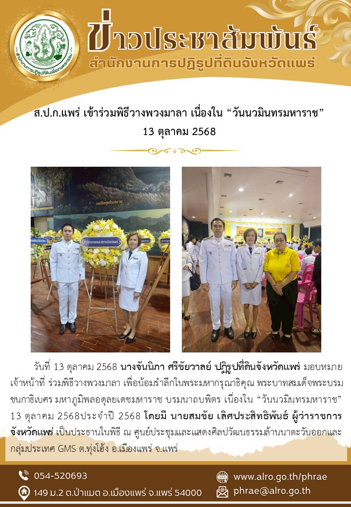 วันที่ 13 ตุลาคม 2568 นางจันนิภา ศรีชัยวาลย์ ปฏิรูปที่ดินจังหวัดแพร่ มอบหมายเจ้าหน้าที่ ร่วมพิธีวางพวงมาลา เพื่อน้อมรำลึกในพระมหากรุณาธิคุณ พระบาทสมเด็จพระบรม