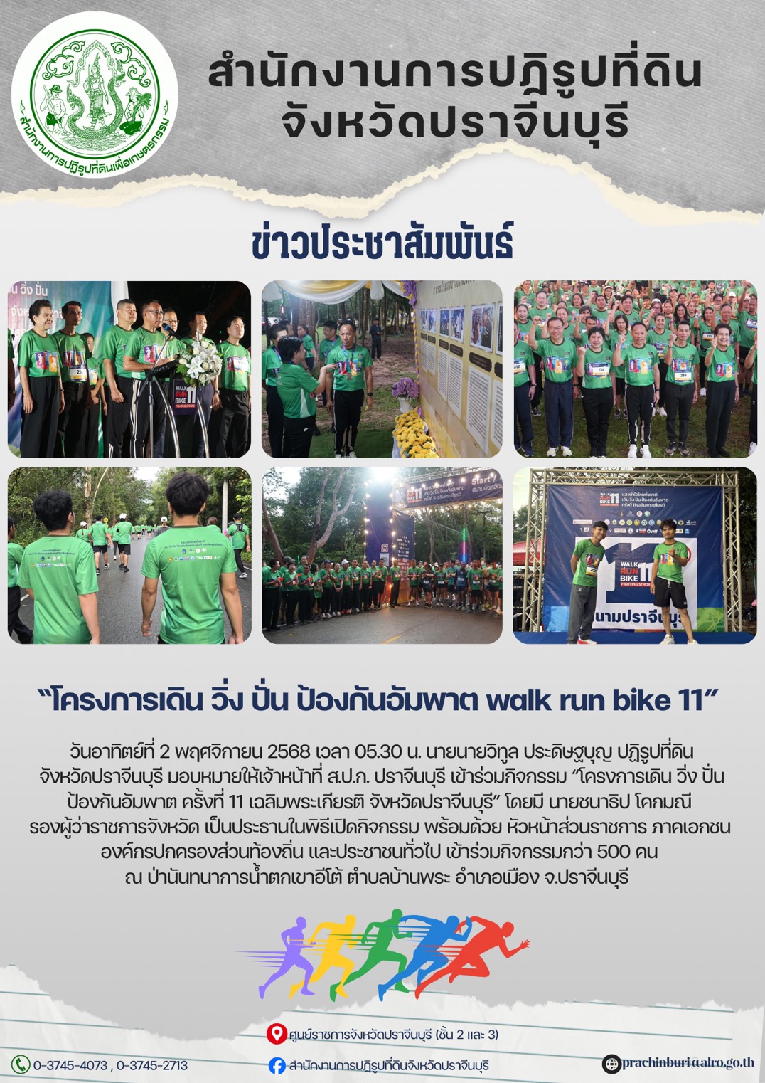 วันอาทิตย์ที่ 2 พฤศจิกายน 2568 เวลา 05.30 น. นายนายวิทูล ประดิษฐบุญ ปฏิรูปที่ดิน จังหวัดปราจีนบุรี มอบหมายให้เจ้าหน้าที่ ส.ป.ก. ปราจีนบุรี เข้าร่วมกิจกรรม “โครงการเดิน วิ่ง ปั่น ป้องกันอัมพาต ครั้งที่ 11 เฉลิมพระเกียรติ จังหวัดปราจีนบุรี”