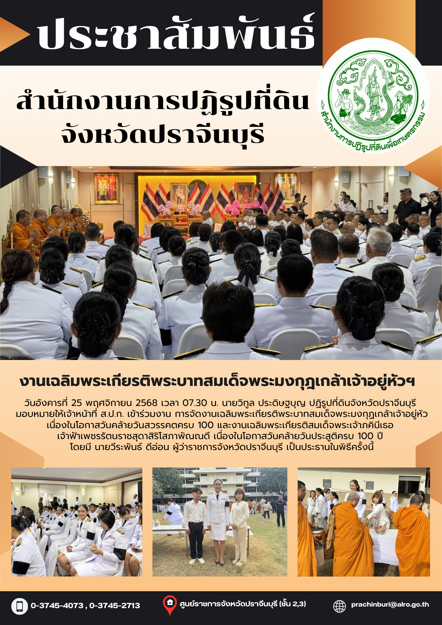 วันอังคารที่ 25 พฤศจิกายน 2568 เวลา 07.30 น. นายวิทูล ประดิษฐบุญ ปฏิรูปที่ดินจังหวัดปราจีนบุรี มอบหมายให้เจ้าหน้าที่ ส.ป.ก. เข้าร่วมงาน การจัดงานเฉลิมพระเกียรติพระบาทสมเด็จพระมงกุฏเกล้าเจ้าอยู่หัว เนื่องในโอกาสวันคล้ายวันสวรรคตครบ 100 และงานเฉลิมพระเกียรติสมเด็จพระเจ้าภคินีเธอ เจ้าฟ้าเพชรรัตนราชสุดาสิริโสภาพัณณดี เนื่องในโอกาสวันคล้ายวันประสูติครบ 100 ปี