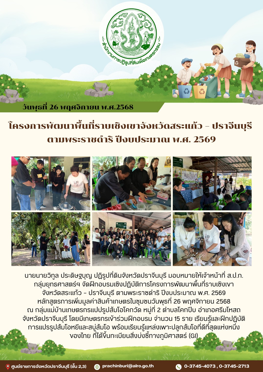 นายนายวิทูล ประดิษฐบุญ ปฏิรูปที่ดินจังหวัดปราจีนบุรี มอบหมายให้เจ้าหน้าที่ ส.ป.ก. กลุ่มยุทธศาสตร์ฯ จัดฝึกอบรมเชิงปฏิบัติการโครงการพัฒนาพื้นที่ราบเชิงเขา จังหวัดสระแก้ว – ปราจีนบุรี ตามพระราชดำริ ปีงบประมาณ พ.ศ. 2569 หลักสูตรการเพิ่มมูลค่าสินค้าเกษตรในชุมชนวันพุธที่ 26 พฤศจิกายน 2568
