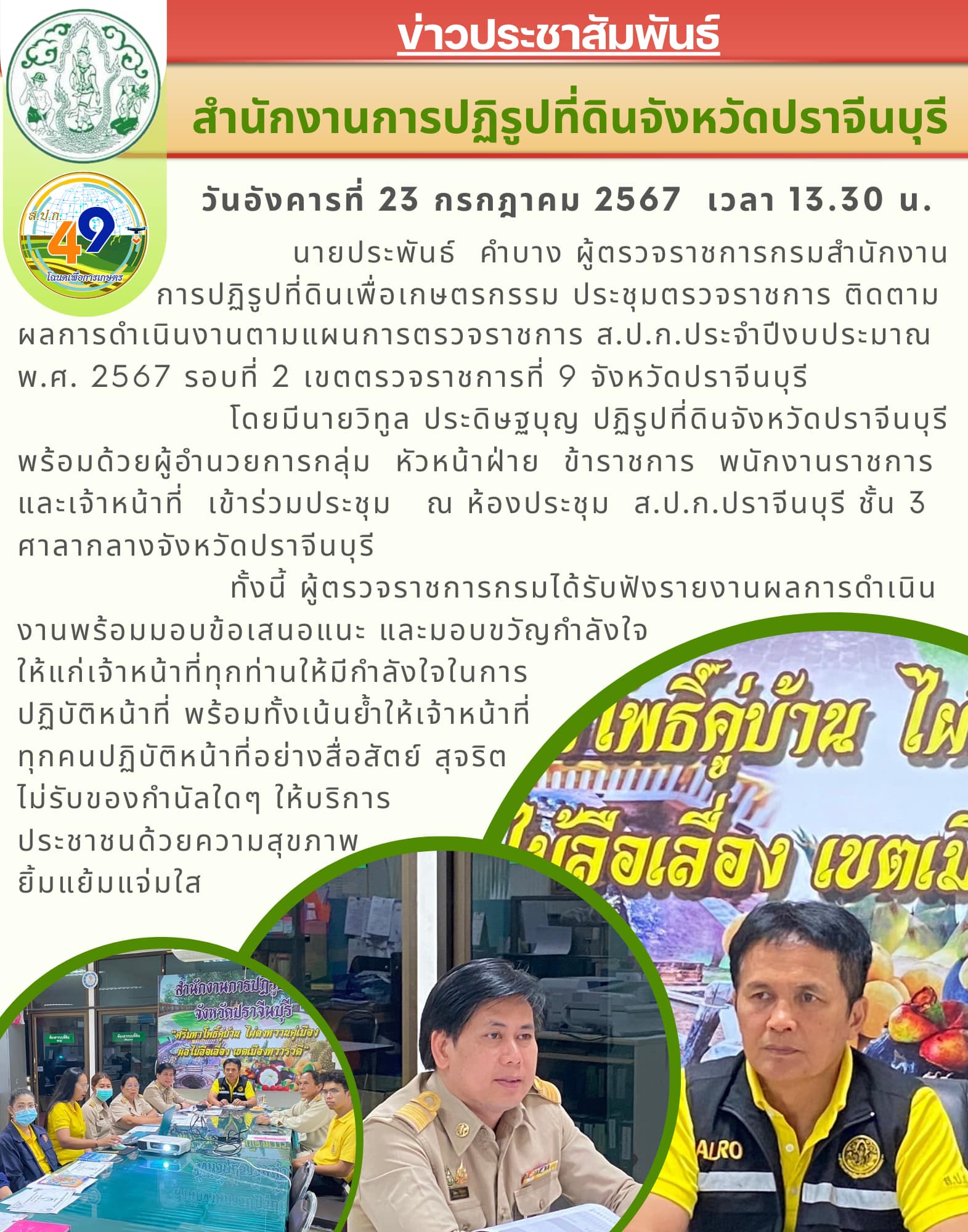 วันอังคารที่ 23 กรกฎาคม 2567 เวลา 13.30 น. ✍️ผู้ตรวจราชการกรมสำนักงานการปฏิรูปที่ดินเพื่อเกษตรกรรม ประชุมตรวจราชการ ติดตามผลการดำเนินงานตามแผนการตรวจราชการ ส.ป.ก.ประจำปีงบประมาณ พ.ศ. 2567 รอบที่ 2 เขตตรวจราชการที่ 9 จังหวัดปราจีนบุรี