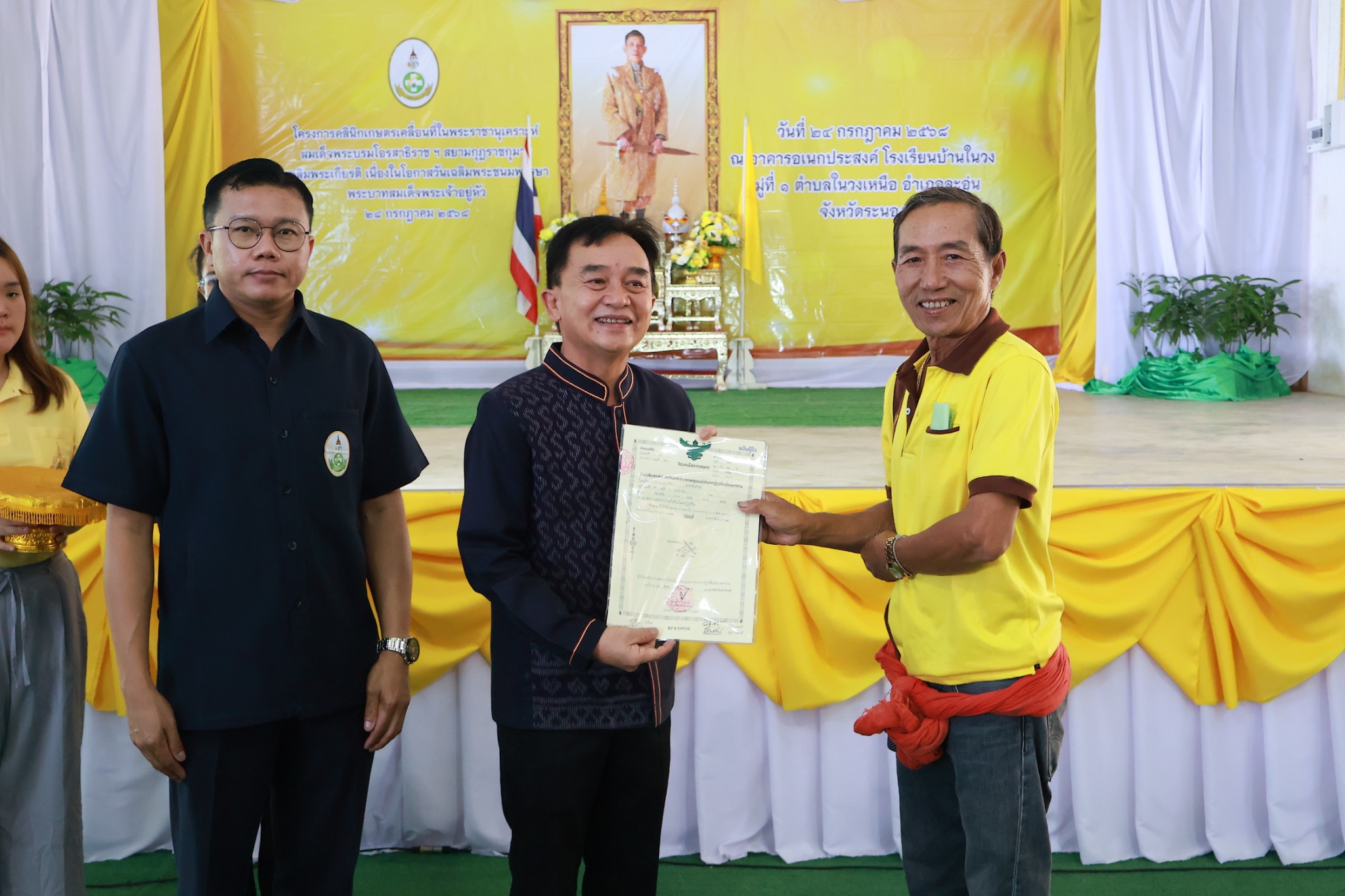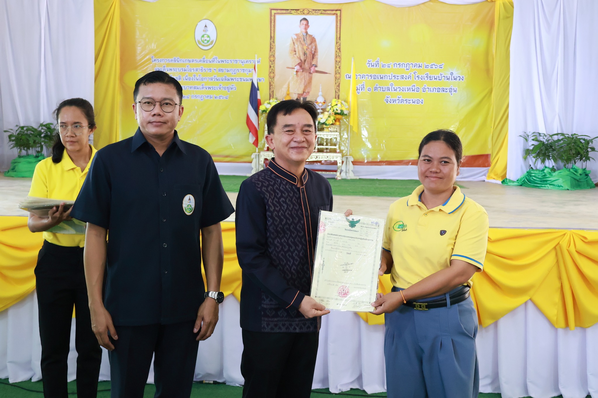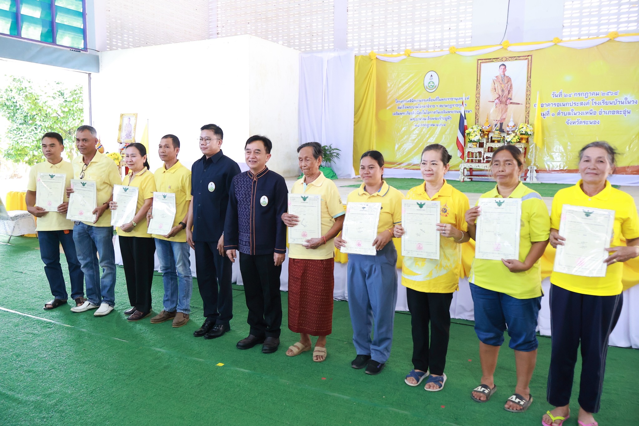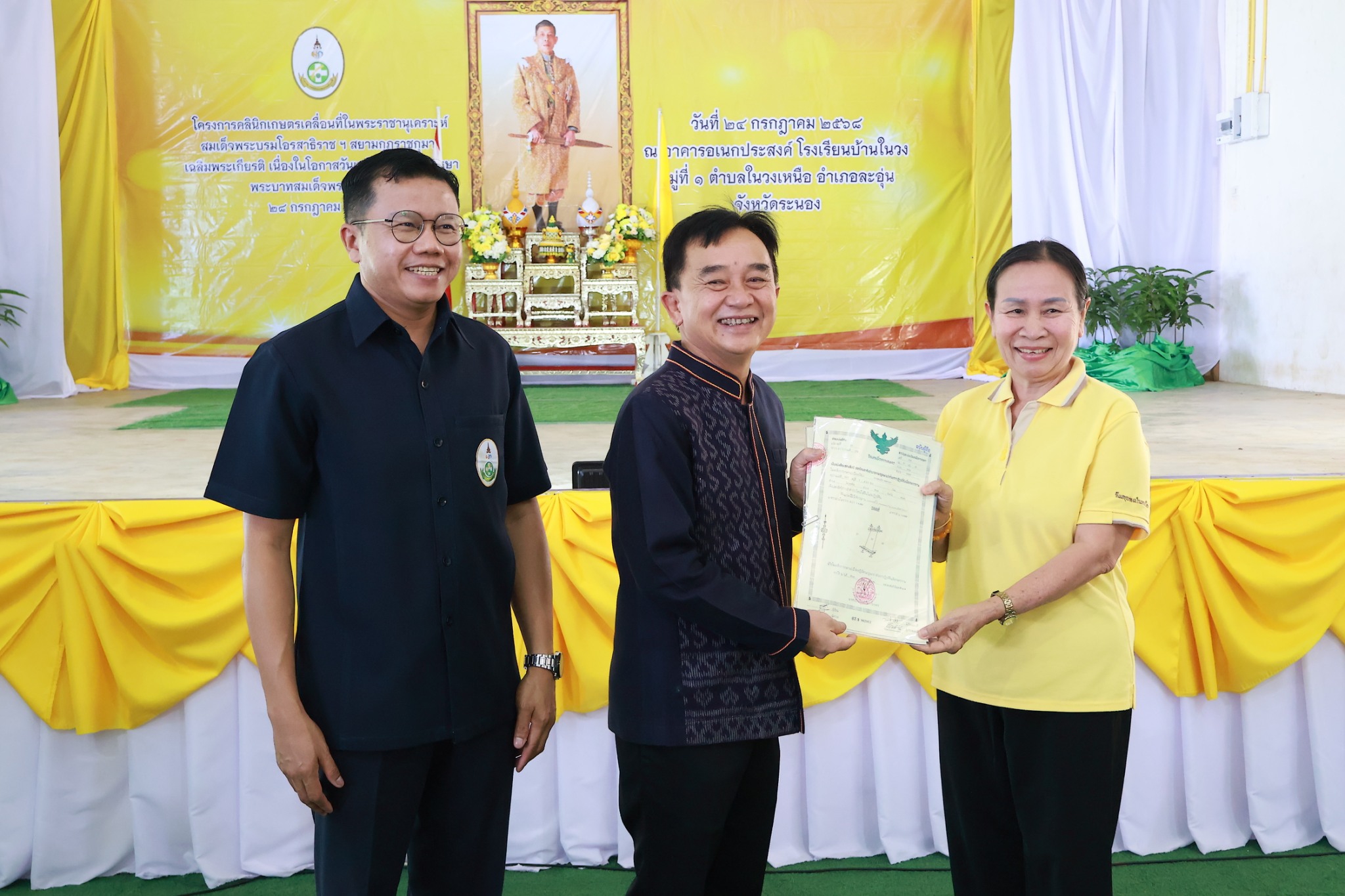(24 ก.ค. 68) เวลา 10.00 น. ณ อาคารอเนกประสงค์ โรงเรียนบ้านในวง หมู่ที่ 1 ตำบลในวงเหนือ อำเภอละอุ่น จังหวัดระนอง นายสุพจน์ ภูติเกียรติขจร ผู้ว่าราชการจังหวัดระนอง เป็นประธานในพิธีเปิดโครงการคลินิกเกษตรเคลื่อนที่ในพระราชานุเคราะห์ สมเด็จพระบรมโอรสาธิราช ฯ สยามมกุฎราชกุมาร เฉลิมพระเกียรติ เนื่องในโอกาสวันเฉลิมพระชนมพรรษาพระบาทสมเด็จพระเจ้าอยู่หัว 28 กรกฎาคม 2568 และเป็นประธานในพิธีมอบโฉนดเพื่อการเกษตรให้แก่เกษตรกรในเขตปฏิรูปที่ดินจังหวัดระนอง จำนวน 10 ราย โดยมี นายสกัด โฉมมงคล ปฏิรูปที่ดินจังหวัดระนอง หัวหน้าส่วนราชการเข้าร่วมพิธีมอบโฉนดเพื่อการเกษตร พร้อมได้จัดนิทรรศการให้ความรู้ด้านกฎหมาย ด้านการรังวัดที่ดิน ด้านสินเชื่อเงินกองทุนปฏิรูปที่ดินเพื่อเกษตรกรรม รับคำขอออกโฉนดเพื่อการเกษตร แจกเอกสารเผยแพร่ ส.ป.ก. และเมล็ดพันธุ์ผัก จำนวน 50 ซอง ให้กับเกษตรกรที่มารับบริการ
