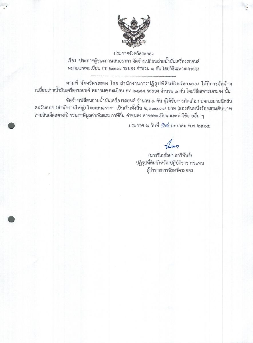 ประกาศจังหวัดระยอง เรื่อง ประกาศผู้ชนะการเสนอราคา จัดจ้างเปลี่ยนถ่ายน้ำมันเครื่องรถยนต์ราชการ หมายเลขทะเบียน กท 2188 ระยอง จำนวน 1 คัน โดยวิธีเฉพาะเจาะจง