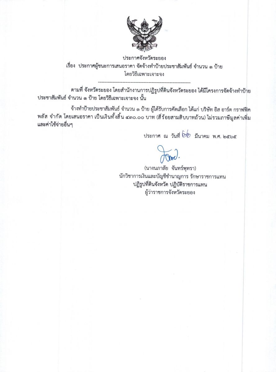 ประกาศจังหวัดระยอง เรื่อง ประกาศผู้ชนะการเสนอราคา จัดซื้อจัดจ้างป้ายประชาสัมพันธ์ โครงการพัฒนาเกษตรกรปราดเปรื่อง จำนวน 1 ป้าย โดยวิธีเฉพาะเจาะจง