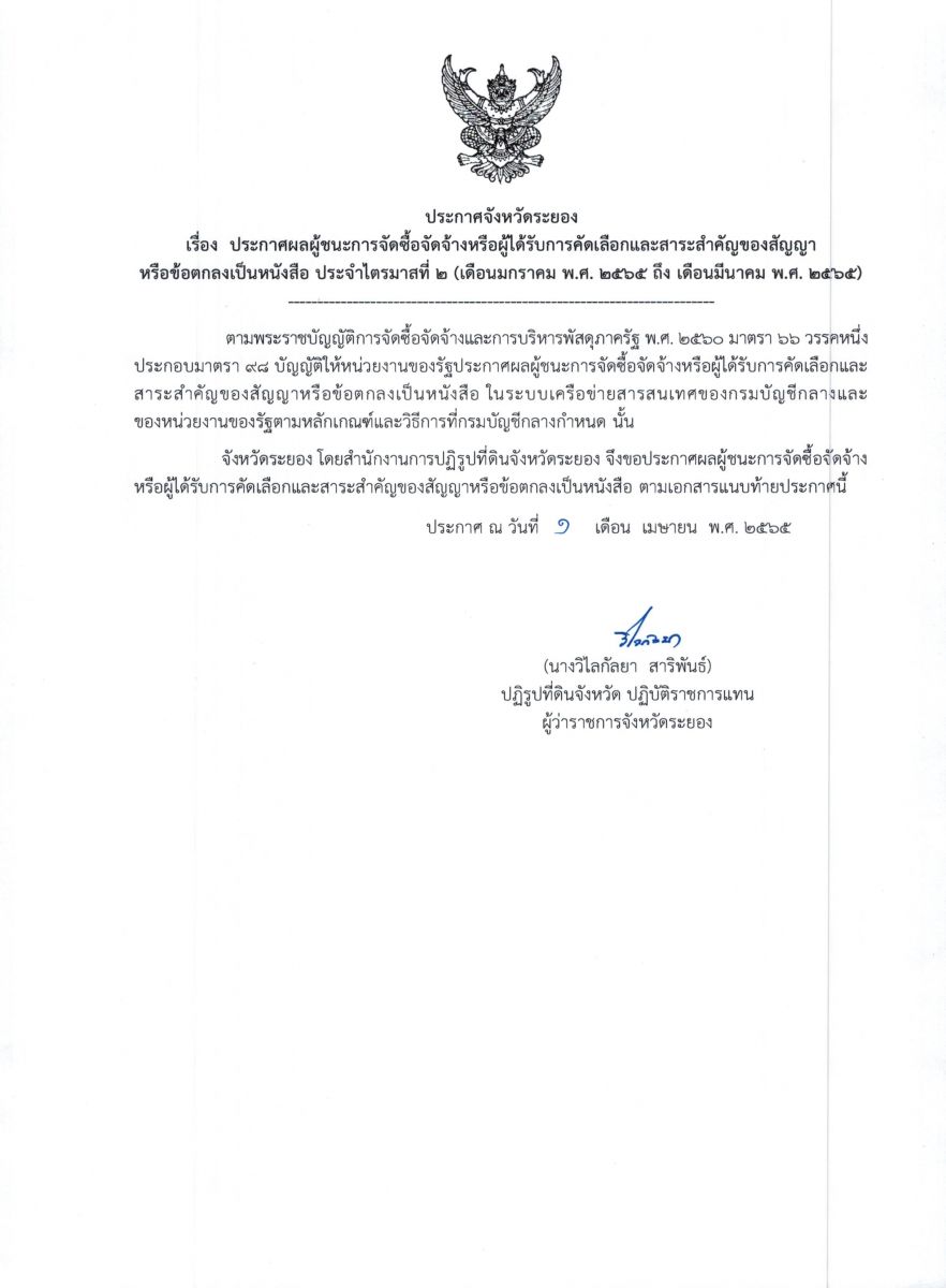 ประกาศจังหวัดระยอง เรื่อง ประกาศผู้ชนะการจัดซื้อจัดจ้างหรือผู้ได้รับการคัดเลือกและสาระสำคัญของสัญญาหรือข้อตกลงเป็นหนังสือ ประจำไตรมาสที่ 2 (เดือนมกราคม พ.ศ. 2565 ถึง เดือนมีนาคม พ.ศ. 2565)