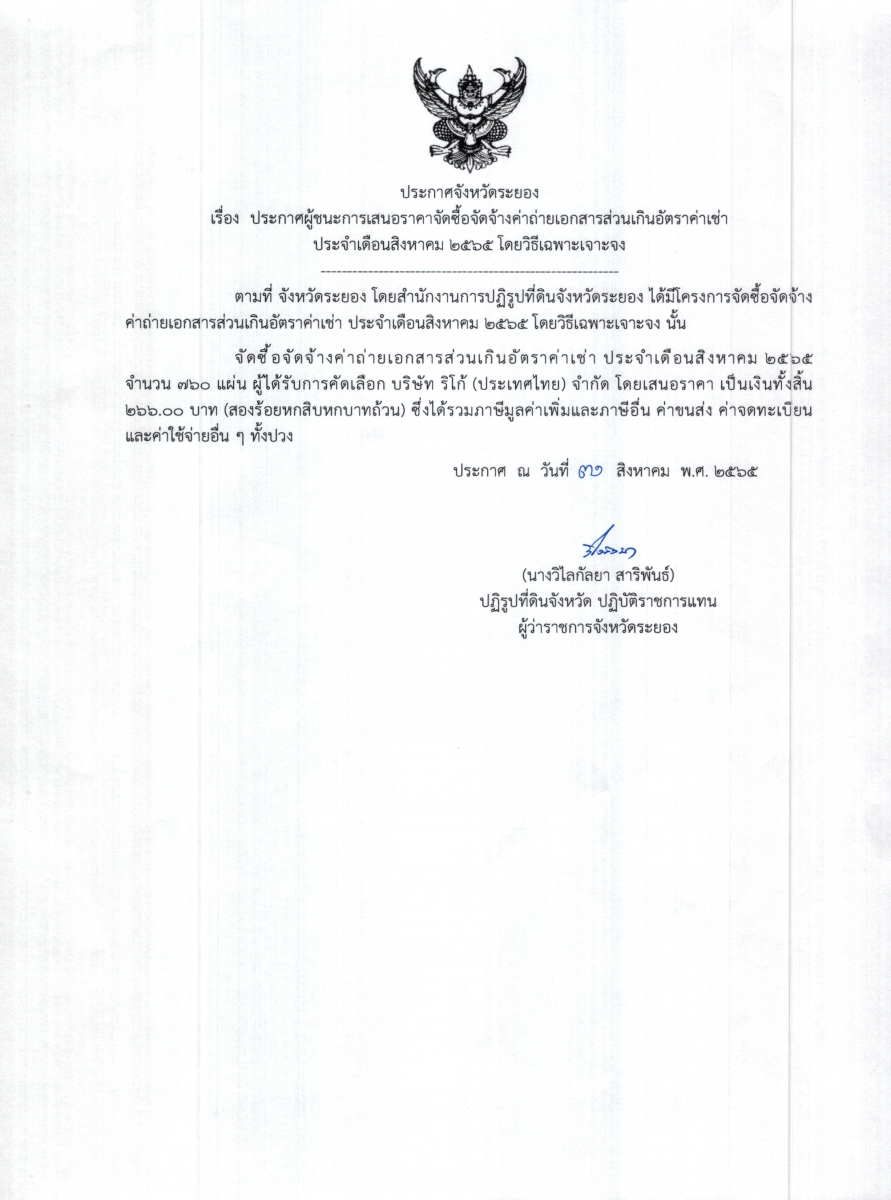 ประกาศจังหวัดระยอง เรื่อง ประกาศชนะการเสนอราคา จัดซื้อจัดจ้างค่าถ่ายเอกสารส่วนเกินอัตราค่าเช่า ประจำเดือนสิงหาคม 2565 โดยวิธีเฉพาะเจาะจง